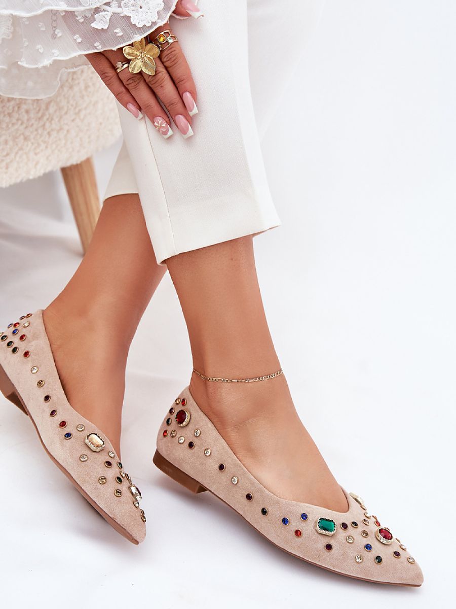 Women’s ballet flats made of eco suede, decorated with crystals that add elegance and shine to them. Pointed toes visually elongate the legs, giving the shoes a slender and stylish look. Perfect for formal and everyday occasions.