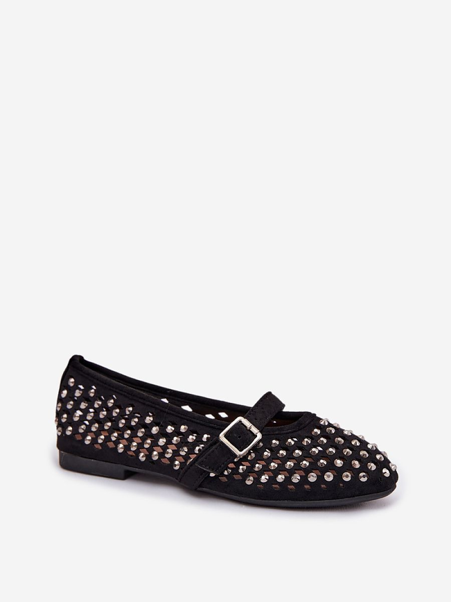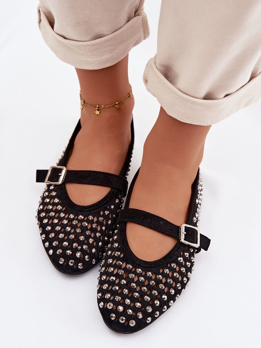 Women’s ballerina flats made of eco suede are a stylish proposition for warm days. The openwork upper decorated with zircons gives them a delicate shine. The strap fastened with a buckle on the midfoot ensures a good fit and emphasizes the feminine character of the model. Rounded toes complete the classic cut, making the ballerinas perfect for both everyday and more elegant stylizations.