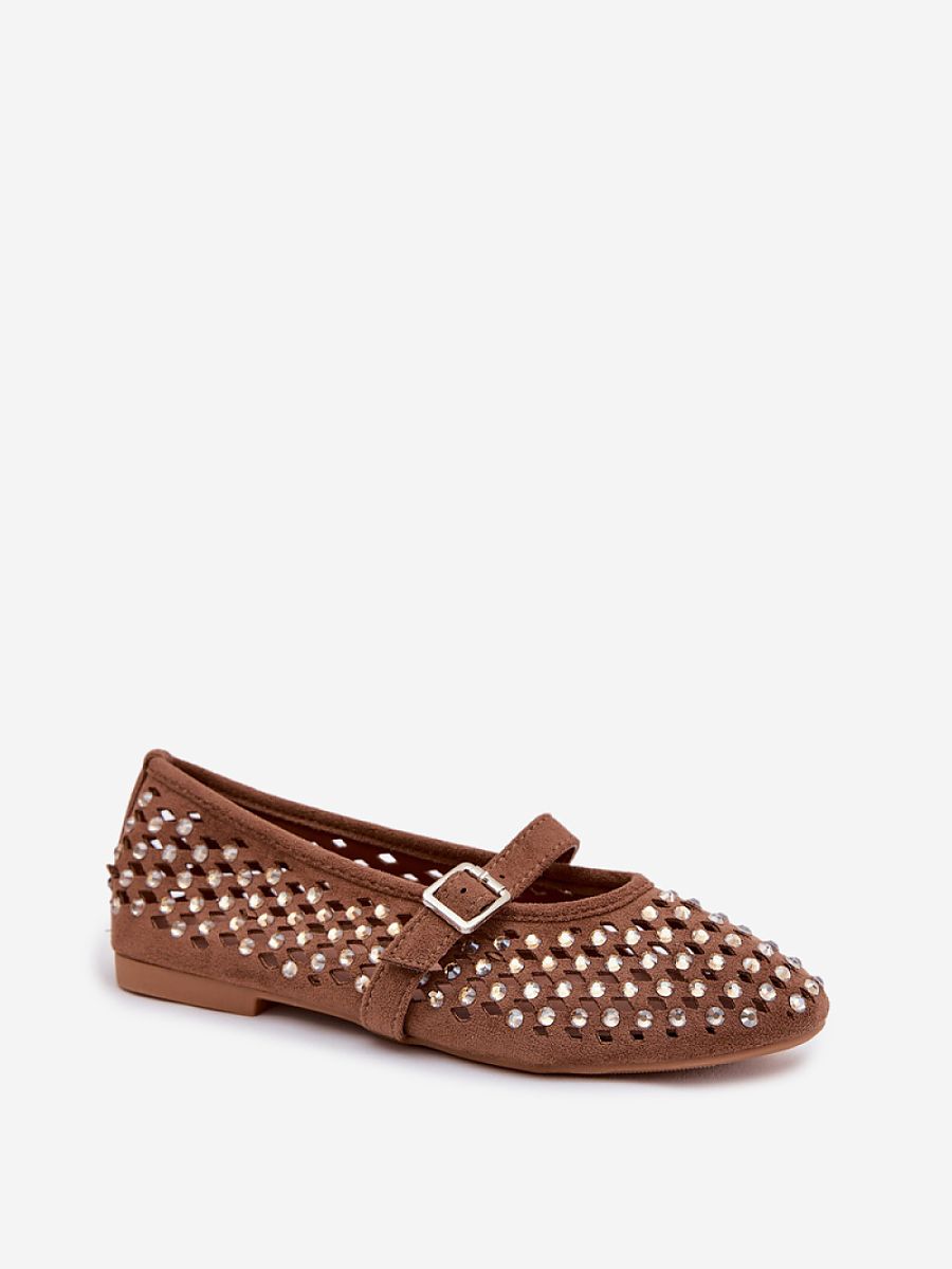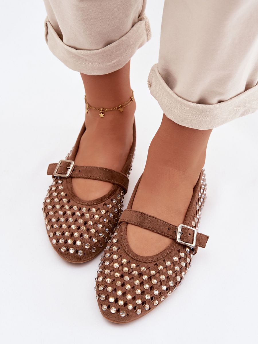Women’s ballerinas made of eco suede are a stylish proposition for warm days. The latticed upper decorated with zircons gives them a delicate glow. The strap fastened with a buckle on the midfoot ensures a good fit and emphasizes the feminine character of the model. Rounded toes complete the classic cut, making ballerinas perfect for both everyday and more elegant stylizations.