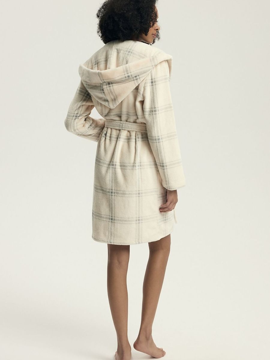 Cozy and stylish women’s bathrobe with a loose, comfortable cut, made of soft material with a print that gives it a feminine character. The model with a hood and practical pockets combines comfort with functionality. The knee-length ensures freedom of movement, and the belt tie allows for a perfect fit to the silhouette. The bathrobe is packed in a plastic bag, a great choice also as a gift.