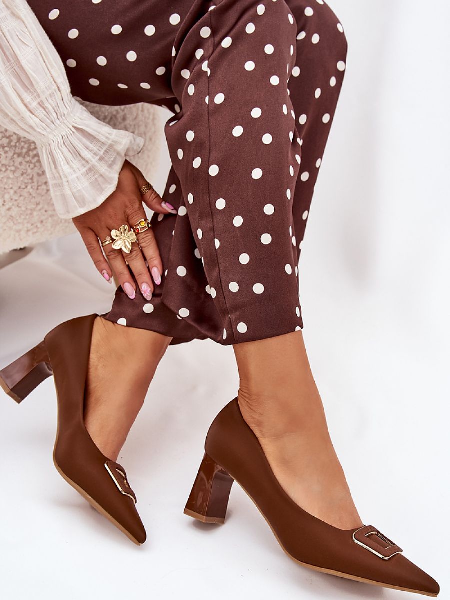 Women’s pumps made of eco leather, set on a column-shaped heel, are an elegant proposition for various occasions. The decorative buckle at the front adds a unique character to them, and the pointed toes visually slim down the legs. Perfect for dresses, skirts or trousers, these pumps combine style, comfort, and a modern look, creating timeless classics in your wardrobe.