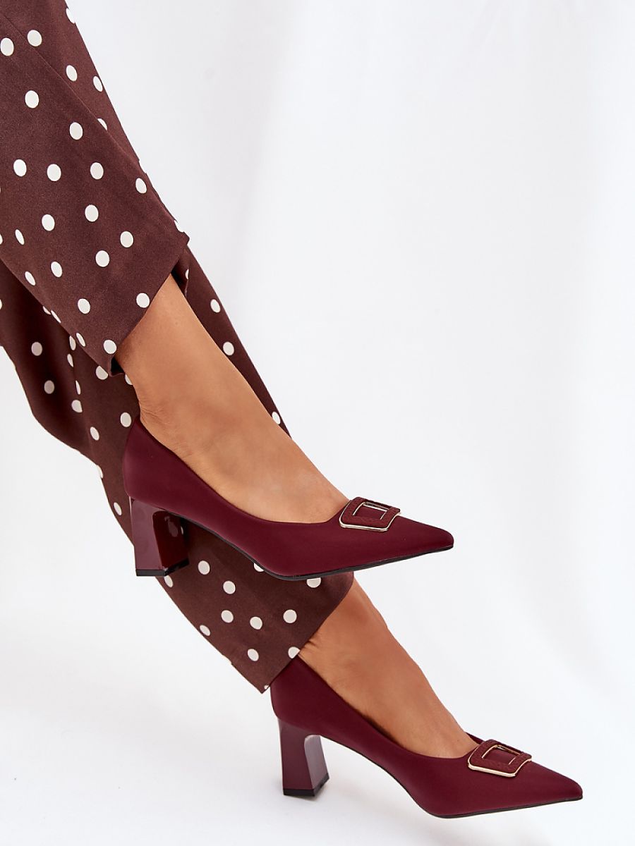 Women’s pumps made of eco leather, set on a column-shaped heel, are an elegant proposal for various occasions. The decorative buckle in the front adds a unique character to them, and the pointed toes visually slim the legs. Perfect for dresses, skirts or pants, these pumps combine style, comfort, and a modern look, creating timeless classic in your wardrobe.