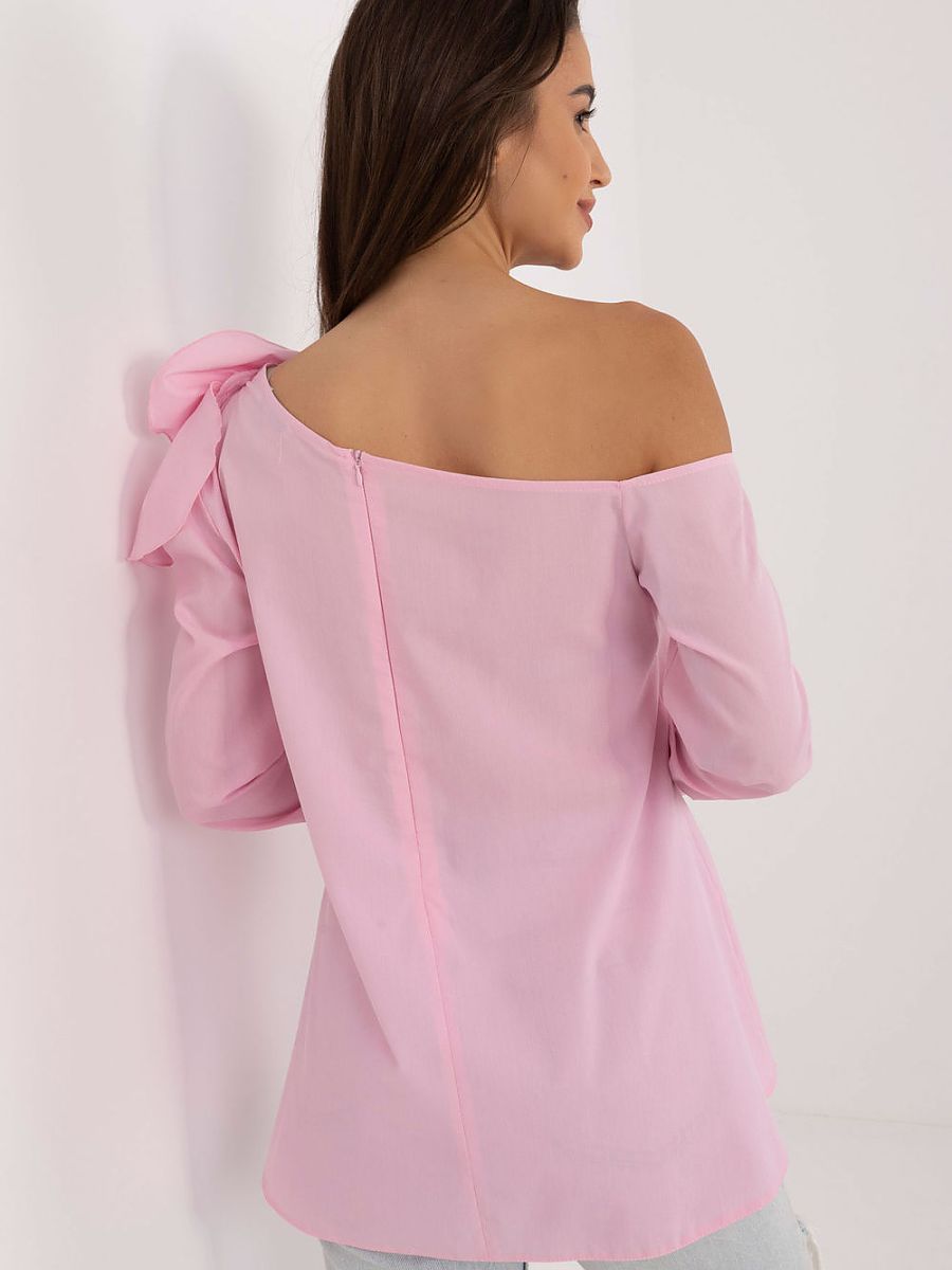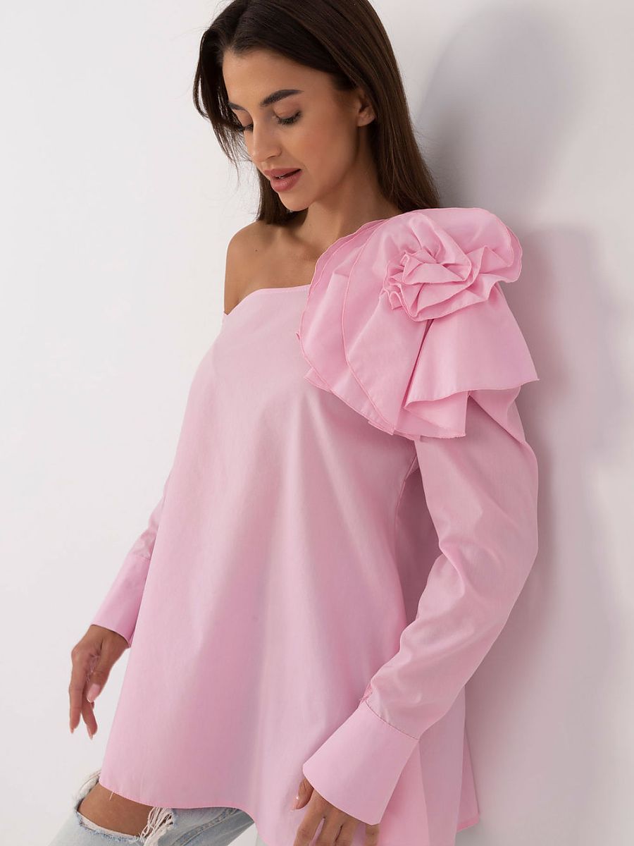 Elegant blouse made of smooth, monochromatic material, ideal for formal occasions and work. Made of high quality cotton, it provides comfortable wear and an elegant look. A decorative fabric flower in the form of a brooch on the left shoulder adds a sophisticated touch, making it unique and stylish. The blouse has an asymmetrical neckline, which emphasizes the modern design, while the long sleeve and standard length make it a versatile closet item. The zipper closure at the back ensures comfort and a perfect fit. An ideal choice for women who appreciate classic elegance with original details.