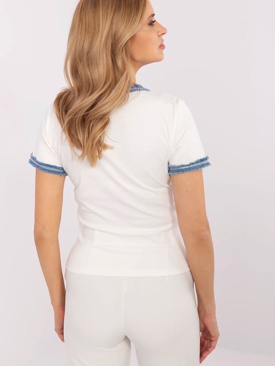 A fitted women’s blouse in a casual style is a great choice for everyday wear. Made from soft cotton with added elastane, it perfectly adapts to the silhouette, providing comfort and freedom of movement. The classic V-neck emphasizes the feminine character, while the short sleeves make the blouse versatile for any season. A unique touch is the denim material finish with decorative buttons, adding originality and lightness. The standard length ensures that the blouse pairs well with both jeans and skirts, creating stylish and comfortable outfits for everyday.