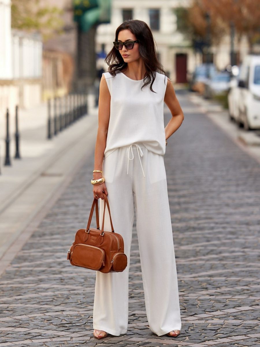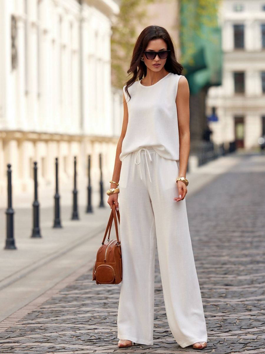 Smooth blouse with a simple cut. Short sleeves and standard length reaching to the hips. Decorative fastening on the back with a small button.
