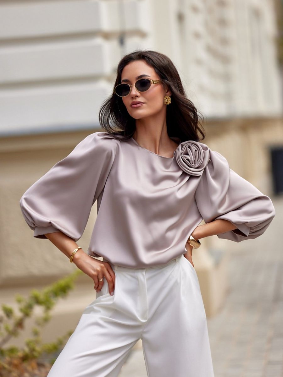 Model Giana is a blouse made of elegant, satin material. The round neckline of the blouse is adorned with a spectacular rose, which gives it class and elegance and makes the blouse look extremely original. Wide, puffy 3/4 length sleeves beautifully emphasize the shoulders and feminine silhouette. Its loose fit provides freedom of movement and comfort when wearing. Blouse Giana will be perfect for elegant and festive stylizations. Pair it with long satin pants Elsa, a jacket with a simple cut, and classic high heels and enjoy impeccable styling perfect for various events such as communions, holidays, baptisms, or birthdays.