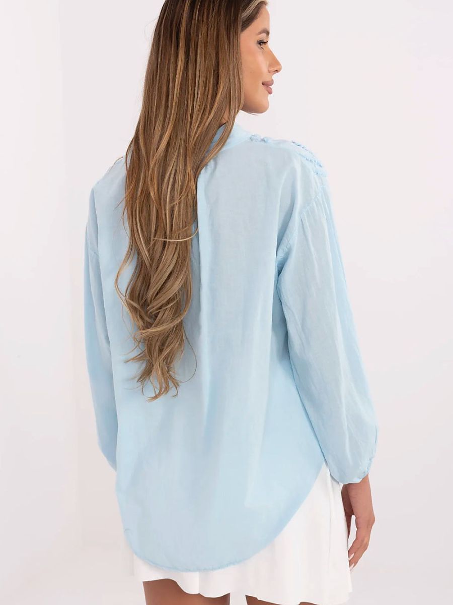Stylish and feminine boho style blouse is a perfect choice for everyday wear, work, and even more formal occasions. Made of cotton material with a varied texture, it enchants with subtle finishing and attention to detail. Standard length, long puffy sleeves finished with elastic and a stand-up collar with a v-neck create an exceptionally harmonious whole. The two-button fastening adds lightness and elegance. This is a versatile model that combines comfort with a trendy, casual boho character.