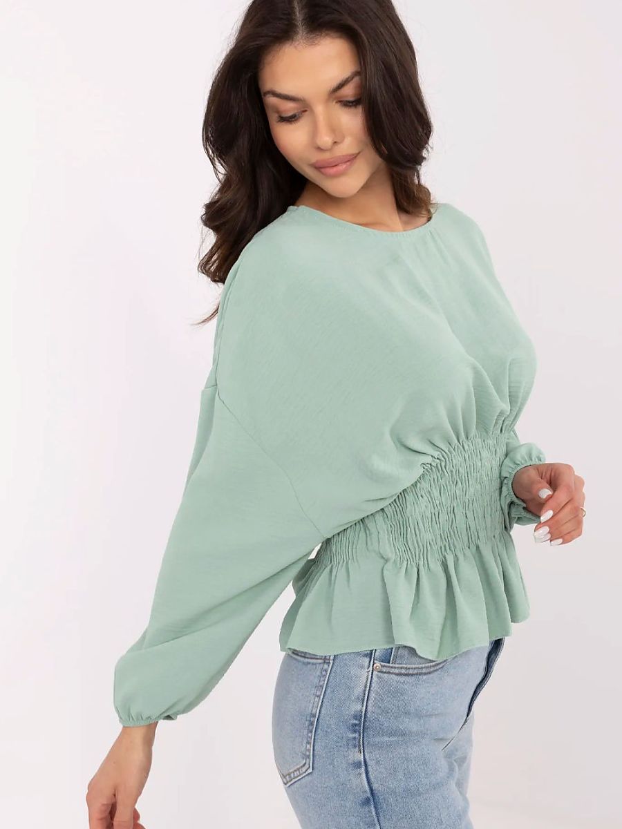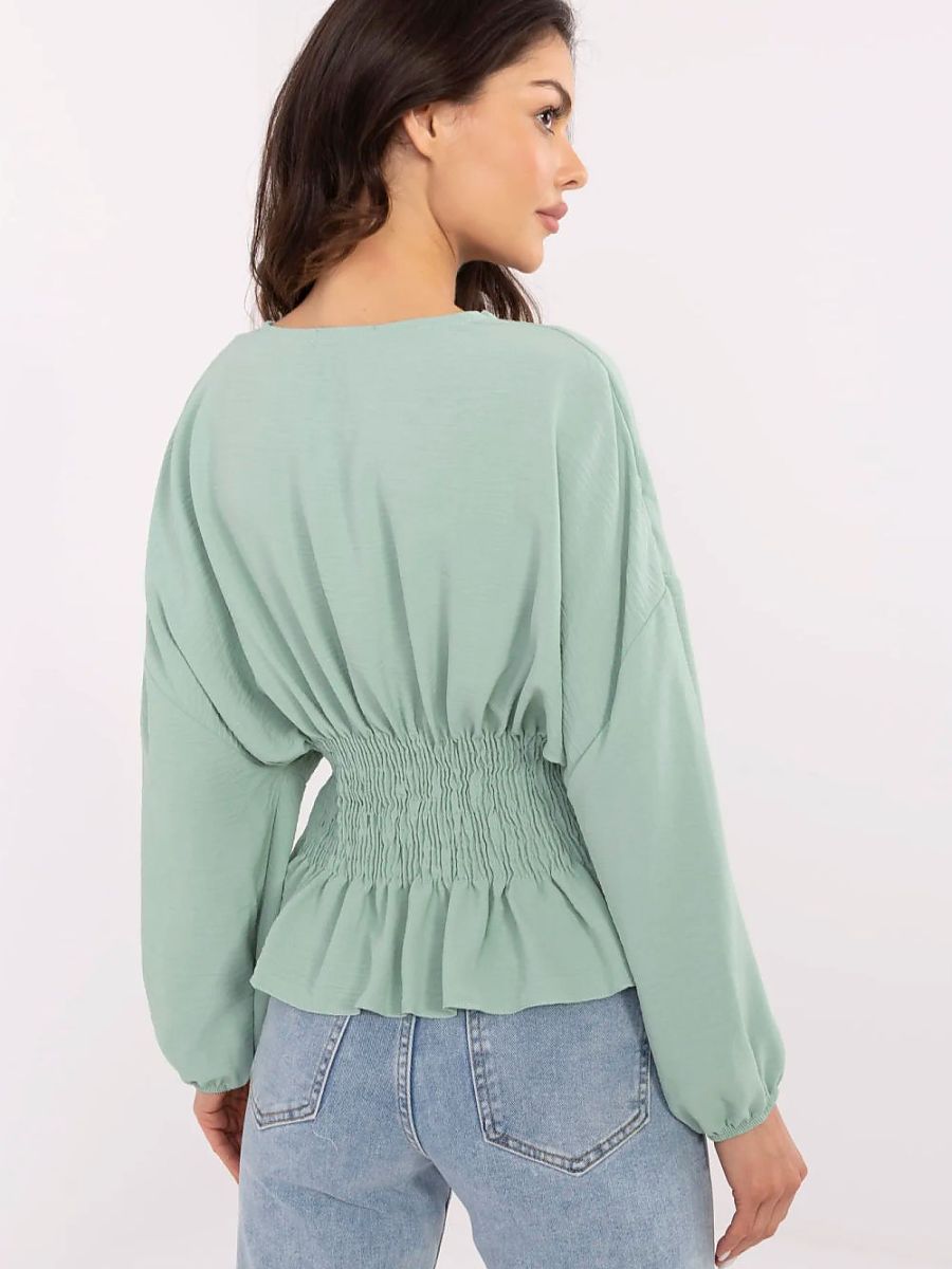 A short, elegant blouse is a stylish proposition for everyday wear, work, and formal occasions. Made of smooth, lightweight polyester, it combines comfort with a chic look. The model dazzles with decorative ruching running from the bust line to the waist, subtly shaping the silhouette and adding a feminine touch. Puffy, long sleeves give the whole a romantic expression, and the classic round neckline emphasizes the elegant style of the blouse. The lack of fastening makes the model comfortable and easy to put on. Ideal for a skirt or high-waisted trousers.