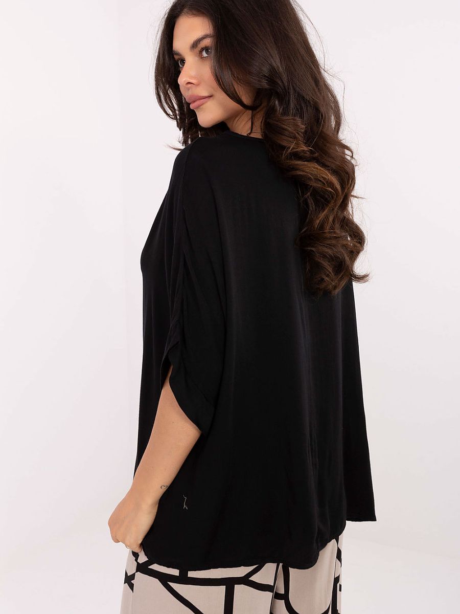 The daily casual blouse is a universal proposition for many stylizations. Made of soft, breathable viscose, it ensures comfort all day long. The smooth fabric gives it a classic and timeless character, perfect for everyday wear to work, for a walk or a meeting with friends. The model is of standard length, with 3/4 sleeves and a V-neckline that subtly emphasizes the neckline. Simple yet elegant, it pairs well with both jeans and a skirt.