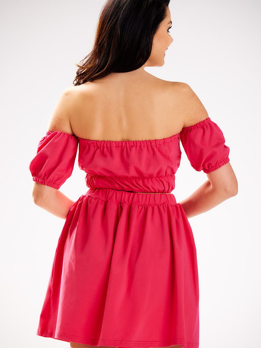 A short blouse with short sleeves and a striking Spanish neckline, which subtly reveals the shoulders. Finished with elastic bands at the waist, sleeves, and neckline, ensuring a better fit to the silhouette and comfort of wearing. Light and feminine, perfect for summer days and evening outings.