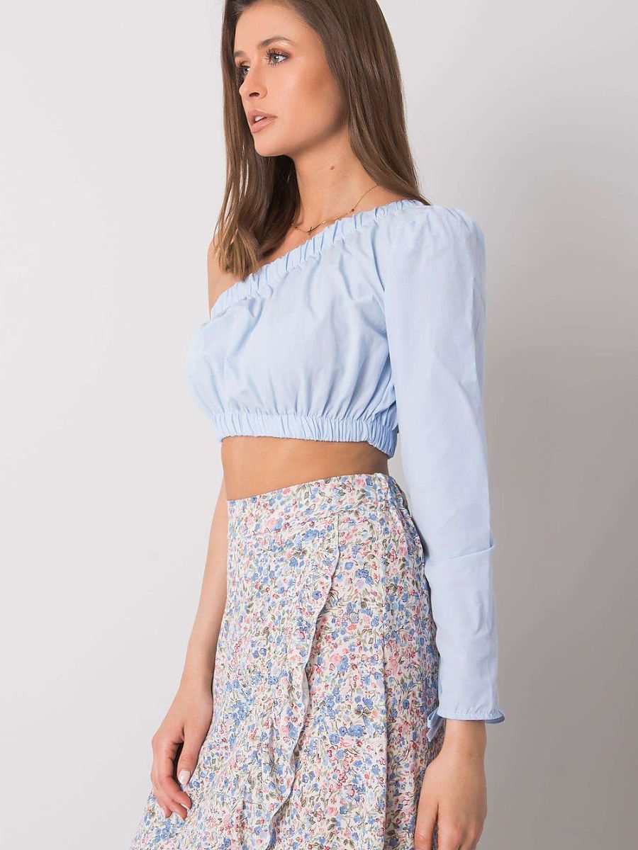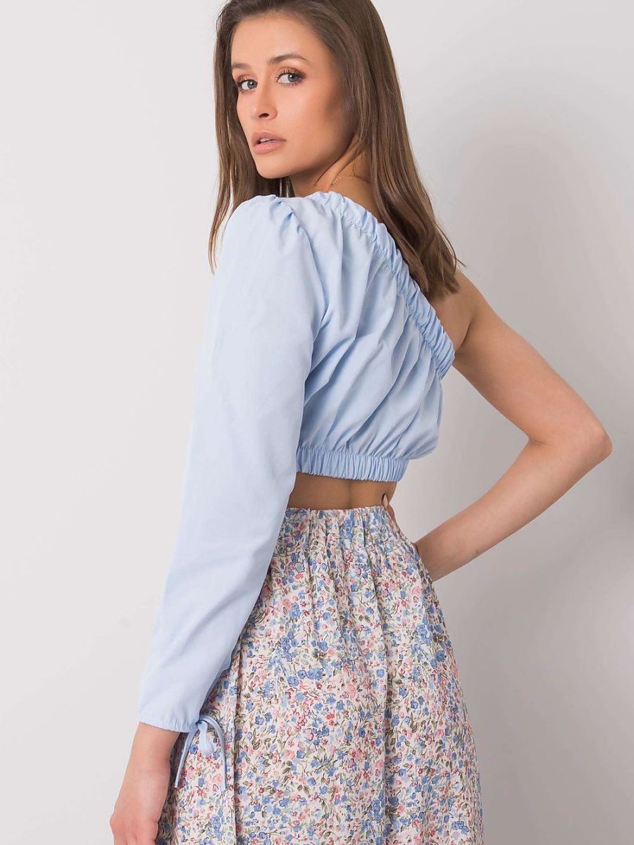 Casual blouse with one long sleeve is a modern proposition for everyday wear, combining comfort with a trendy cut. Made of smooth material, with cotton content, it provides breathability and comfort throughout the day. The model stands out with an asymmetrical neckline and elastic finish with a band at the top of the blouse and under the bust, allowing for better fitting and emphasizing the silhouette. The short length makes it perfect to pair with high-waisted jeans or skirts. An additional accent is the stylish tying at the wrist, giving the whole a light, feminine character. No fastening ensures easy putting on. Perfect for everyday outings when you want to look stylish and feel comfortable.