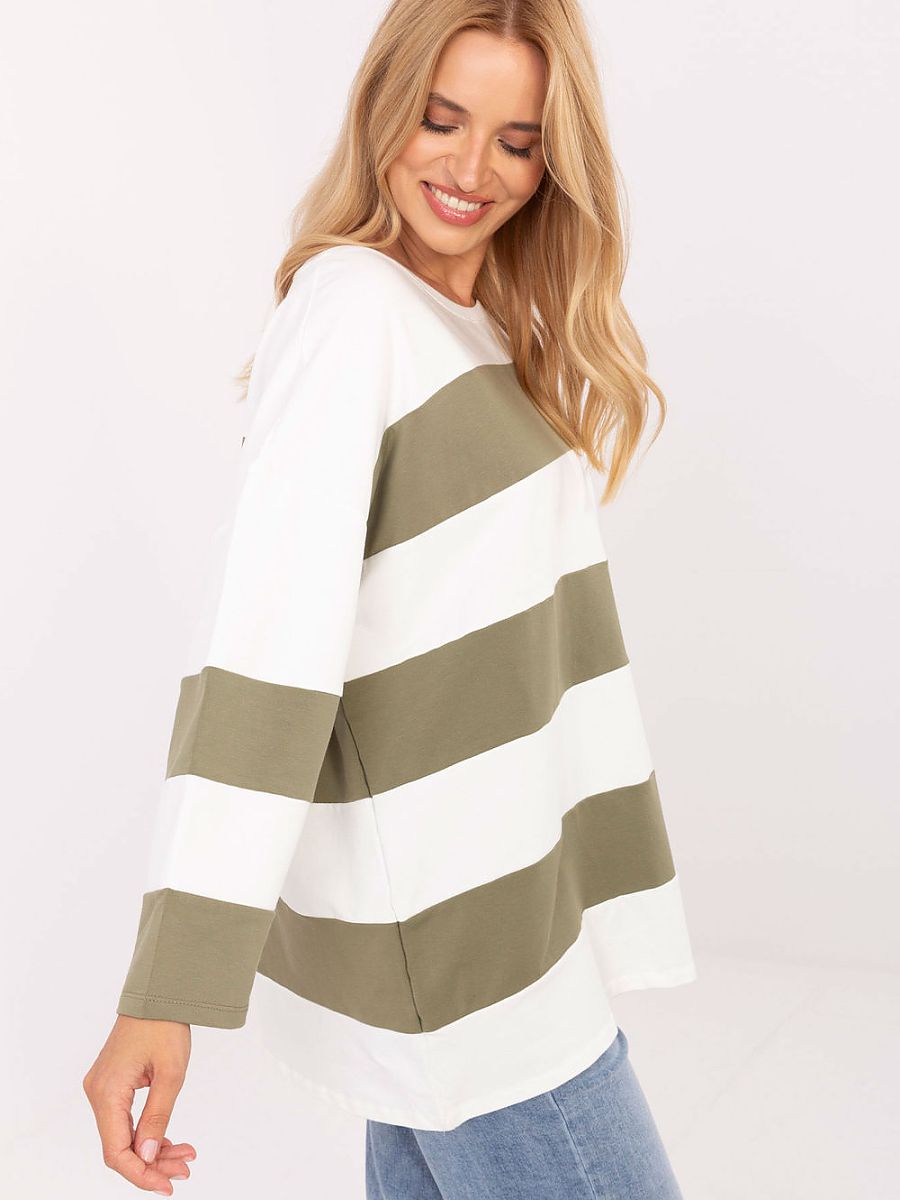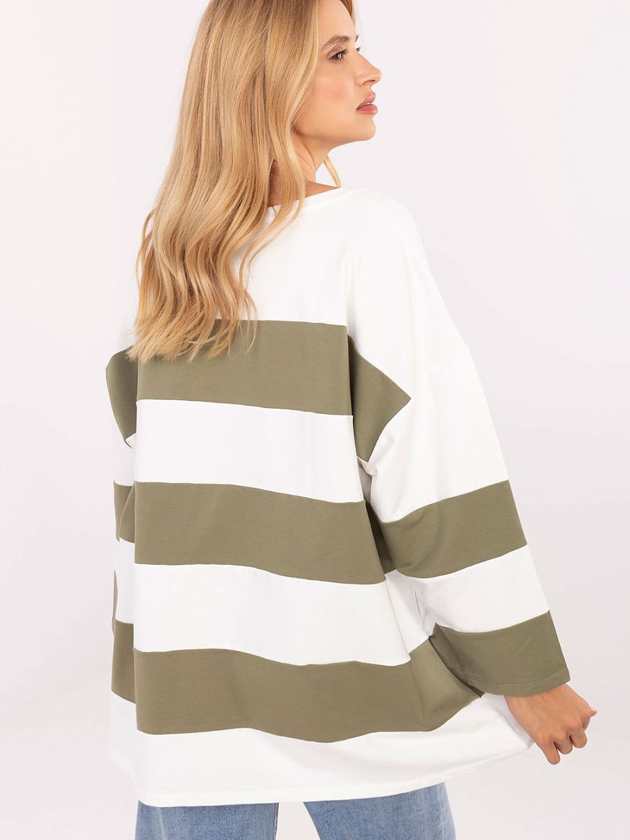 Oversized blouse with a casual character, perfect for everyday styling. Made of a dominant blend of cotton and elastane, it provides comfort and freedom of movement. The longer cut model will work perfectly in combination with leggings or slim trousers. The blouse has long sleeves and a classic round neckline, and its dominant pattern is timeless stripes, which give the whole lightness and freshness. The lack of fastening emphasizes the loose, comfortable cut, fitting into a casual, uncomplicated style.