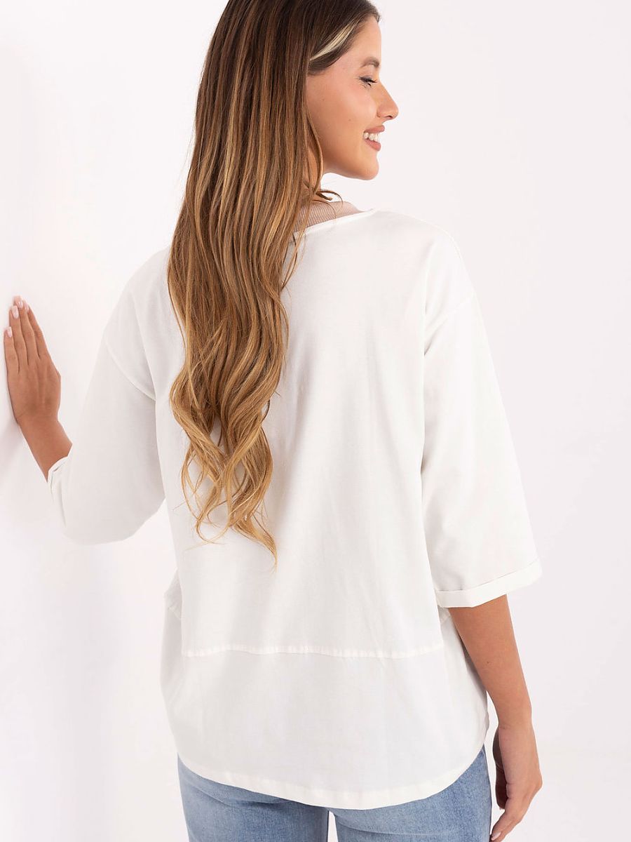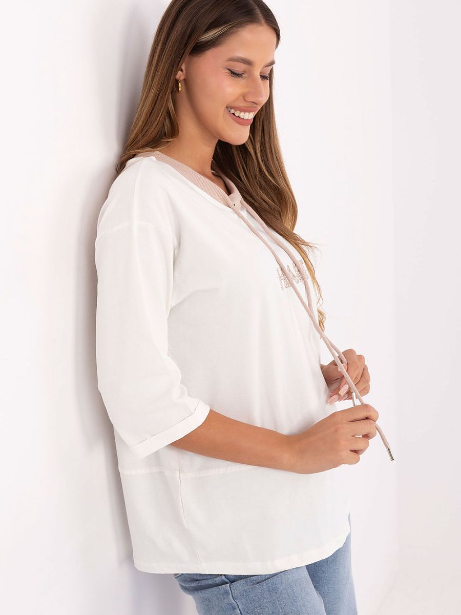 Casual women’s blouse with embroidery on the front and drawstrings at the neckline is a stylish choice for everyday occasions. Made of soft cotton with elastane, it provides comfort and freedom of movement throughout the day. The model of standard length with 3/4 sleeves and a classic round neckline combines simplicity with a fashionable detail, making it perfect for everyday casual stylizations, both with trousers and skirts.