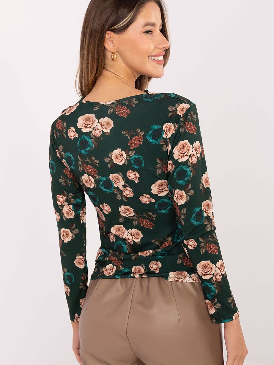 Elegant women’s blouse with a fitted silhouette is a perfect choice for work, business meetings, and everyday wear. Made of a pleasant to the touch blend of viscose and polyester, it combines comfort with durability. The floral pattern gives it a feminine character, while the standard length and long sleeves make it look elegant and timeless. The flowing neckline nicely shapes the silhouette, and the subtle gathering on the left shoulder, adorned with a metal clasp, is a unique accent that emphasizes the elegant style of the blouse. The model without fastening ensures comfort and freedom of wear.
