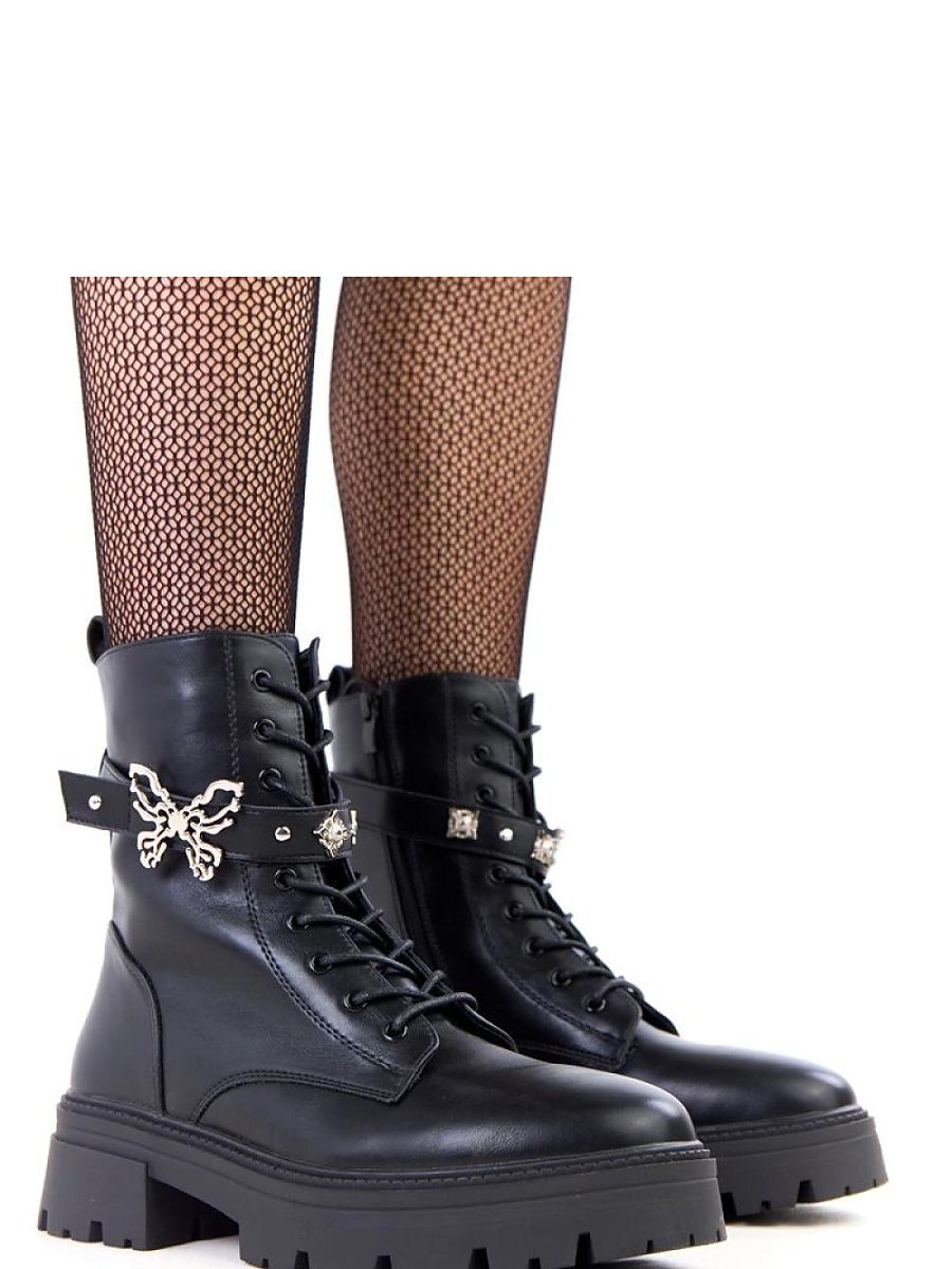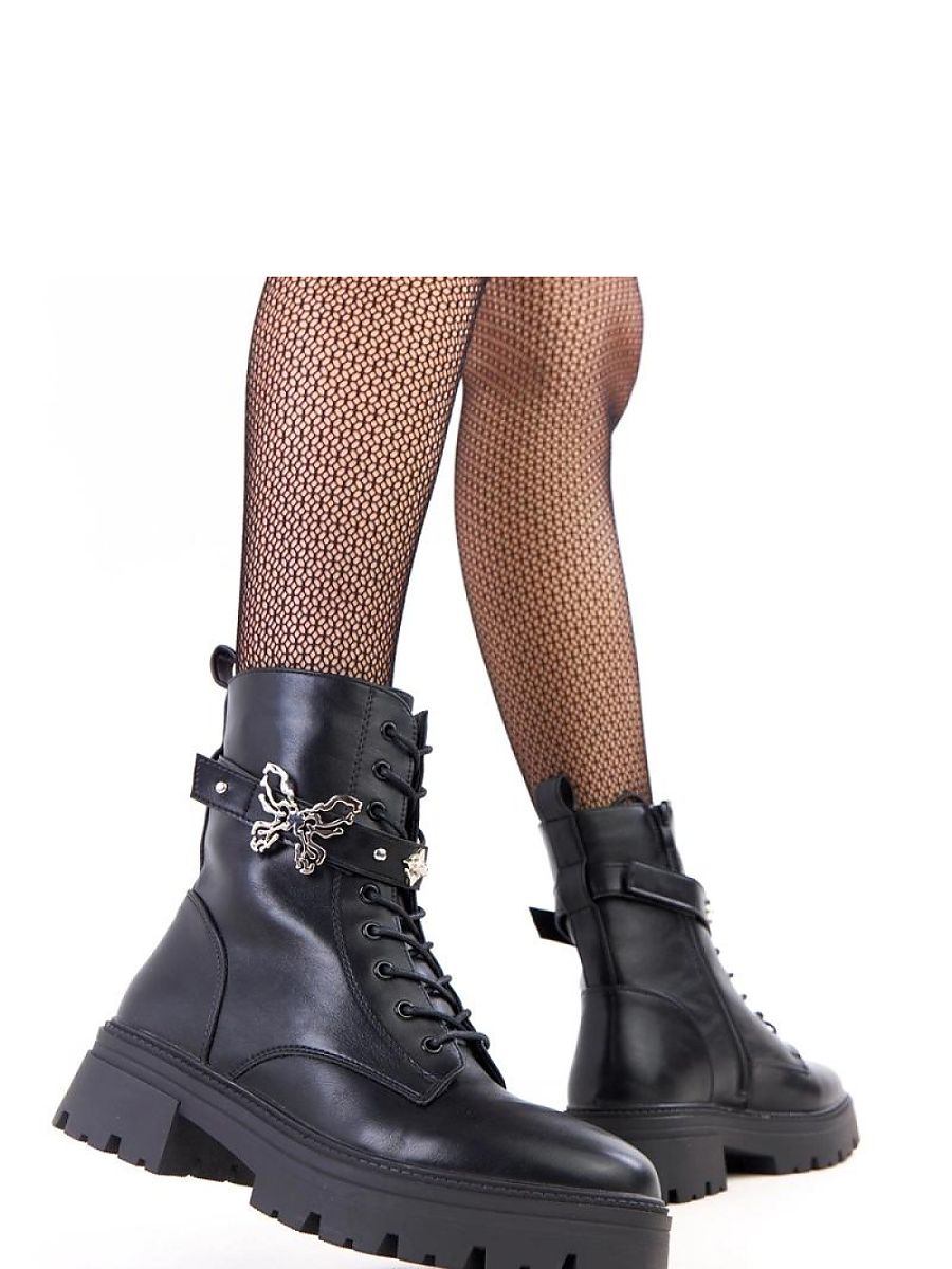 Stylish and practical women’s trappers made of high-quality synthetic leather are an excellent choice for colder days. The model combines a classic cut with trendy details, making it perfect for both everyday and more casual stylizations. The shoes have a zipper closure for easy on and off, as well as additional lacing to perfectly adjust the footwear to the foot. Charm is added by a decorative belt with a metal butterfly, a subtle accent emphasizing the feminine character of the trappers. Thanks to the insulation inside and a soft, fabric insole, the shoes provide comfort and warmth during wear. The stable 5-centimeter heel and raised shaft reaching beyond the ankle guarantee comfort and a confident step.