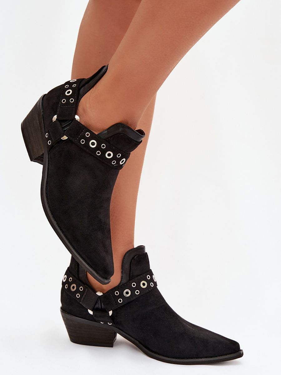 Stylish women’s ankle boots made of eco-suede. Set on a low, cut heel, they provide stability and comfort, and pointed toes visually slim the foot. The upper with decorative straps and eye-catching cutouts gives a fashionable, original character. The slip-on model makes it easy to put on quickly, making the boots perfect for both everyday and more elegant stylizations.