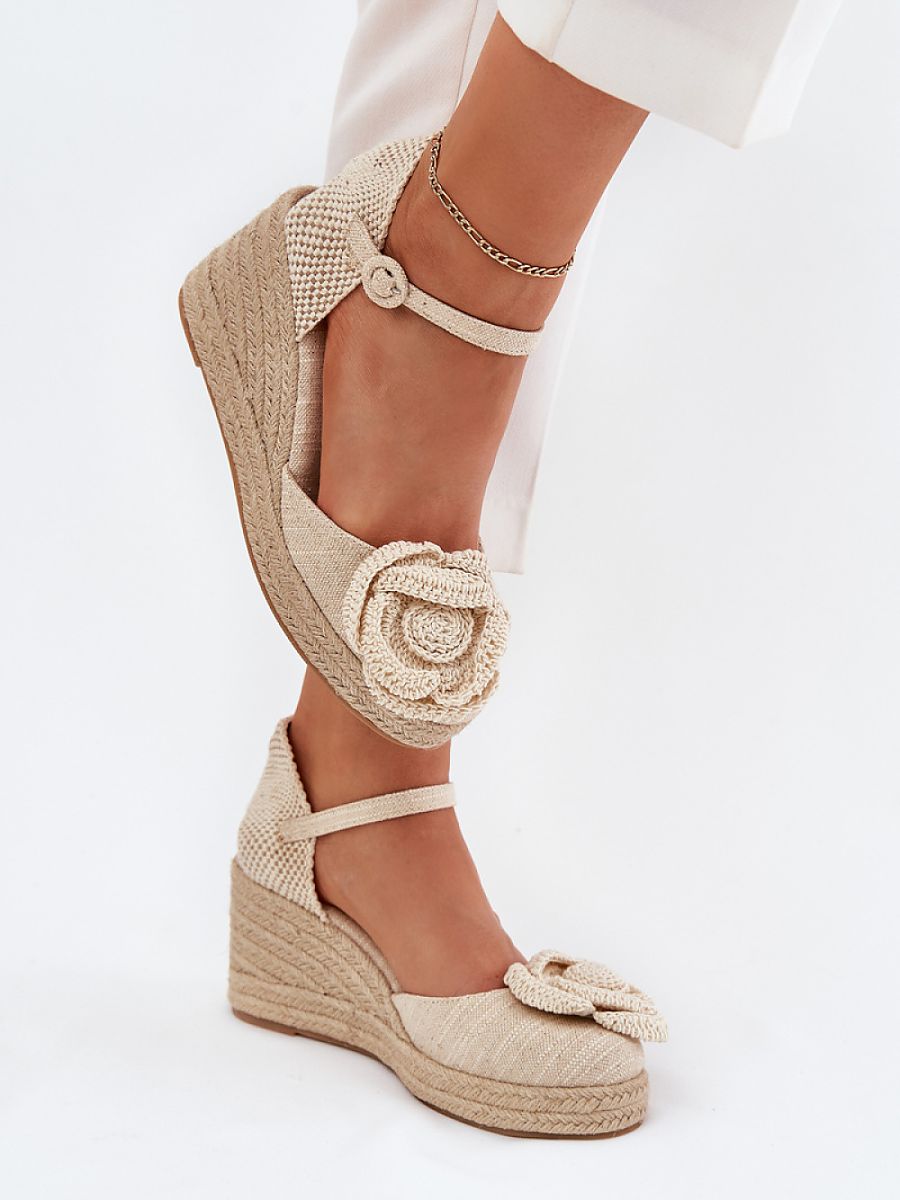 Women’s sandals made of textile material, set on a wedge with a braid, are a stylish and comfortable option for summer days. Covered toes add elegance, and the crocheted flower at the front attracts attention, giving them a unique charm. Fastened with a buckle with an adjustable strap, they ensure a perfect fit to the foot. Perfect for summer stylizations, they combine comfort with a fashionable look.