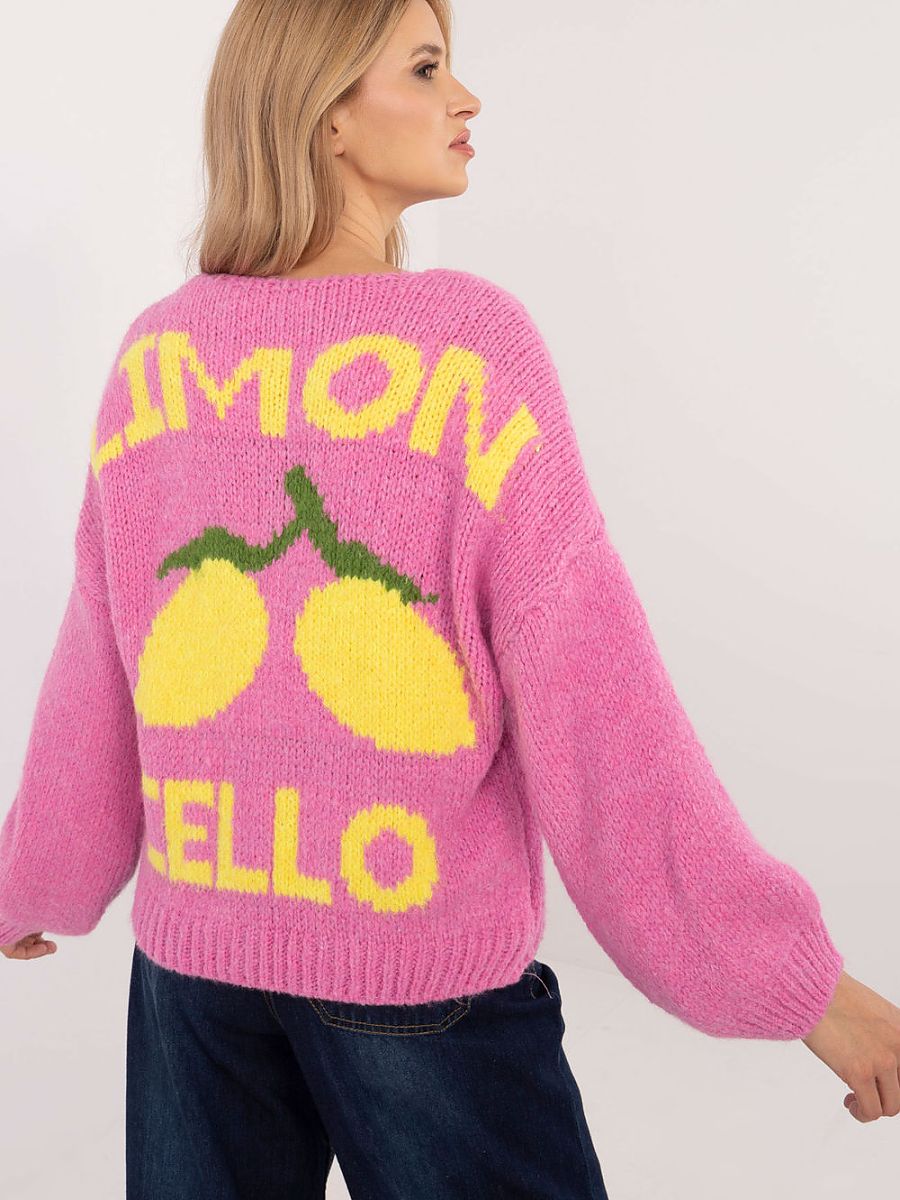 Women’s casual sweater perfect for everyday occasions. It is characterized by an original print placed on the back and a subtle, small print on the front, giving it a unique style. Made from a combination of acrylic, viscose, wool, and polyamide, making it soft, warm, and durable. It has a standard length and long sleeves, and the V-neck adds elegance and femininity. The sweater is fastened with buttons, making it practical and comfortable for everyday use. It will work great in casual stylizations.