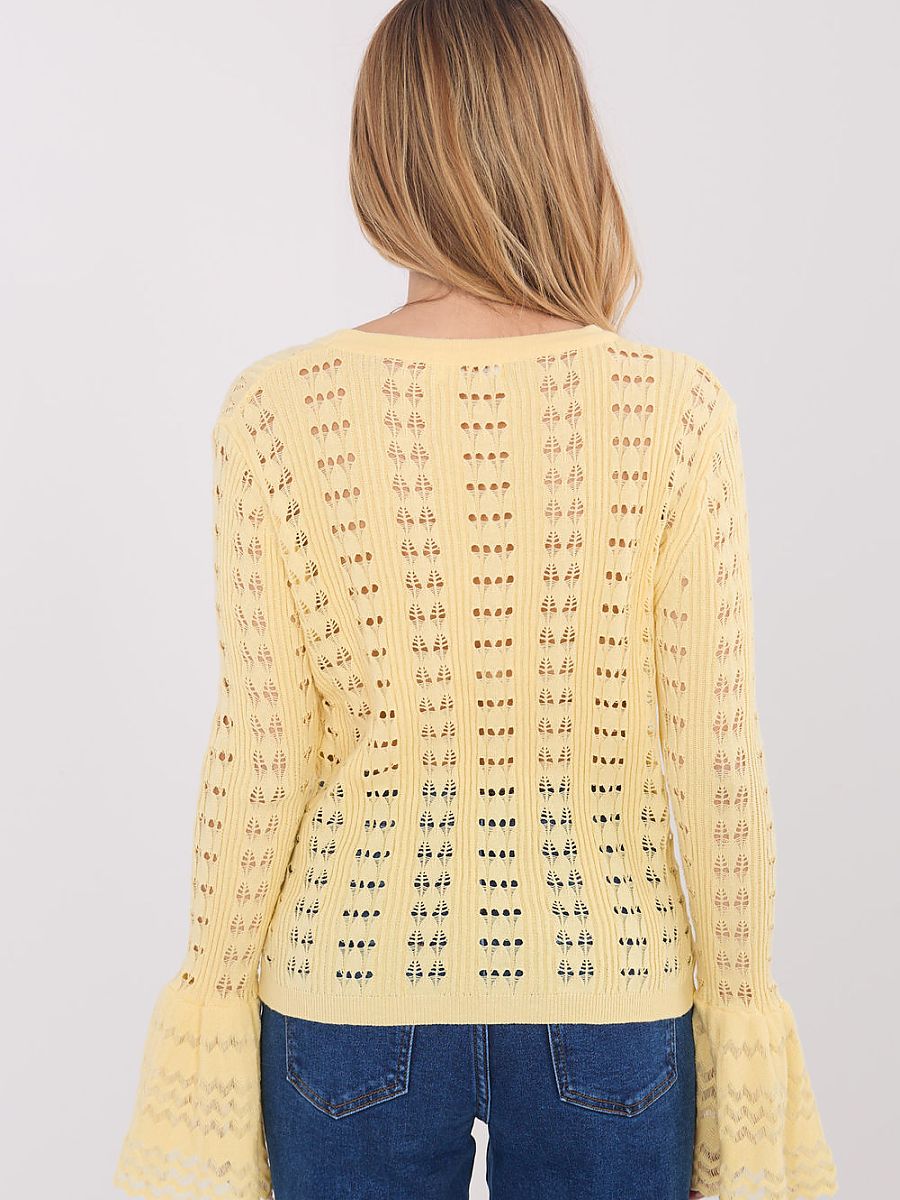 Stylish boho-style women’s sweater, perfect for everyday styling. The model stands out with an impressive openwork pattern that gives the whole lightness, subtlety, and a fashionable, artistic character. The sweater is made of a combination of polyester and viscose, making it soft, pleasant to the touch, and comfortable to wear. The standard length makes the cut universal and easy to combine with various wardrobe items. Long bell sleeves emphasize the boho atmosphere and add a casual elegance to the whole. The model has a V-neckline that visually slims the silhouette, and buttons fastening, allowing you to wear the sweater both unbuttoned and buttoned. This is an excellent choice for women who appreciate comfort, natural style, and original details in their everyday outfits.