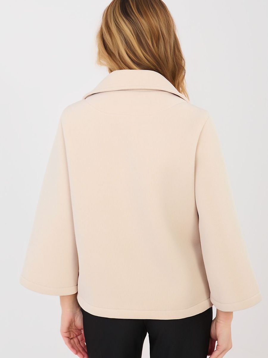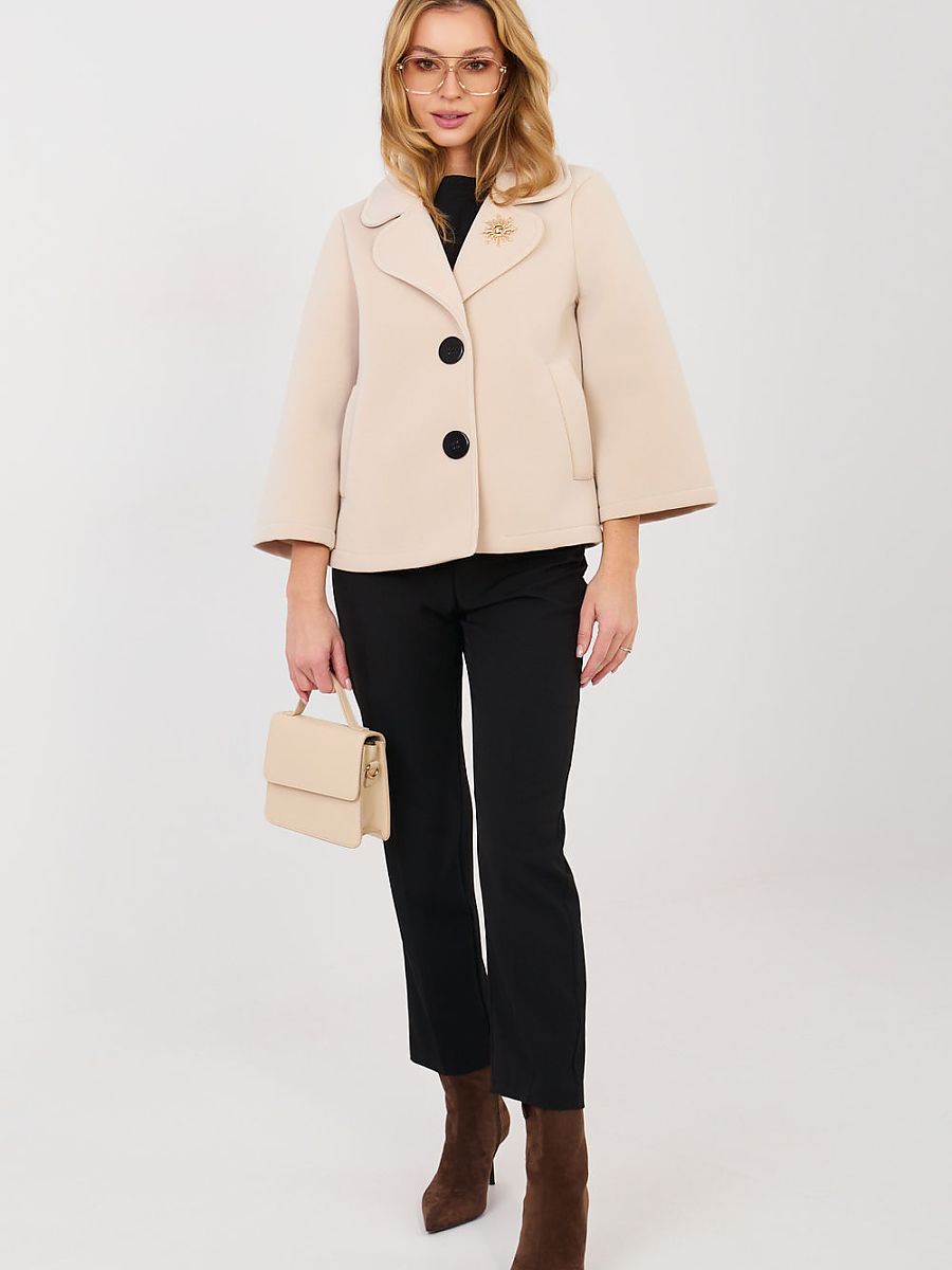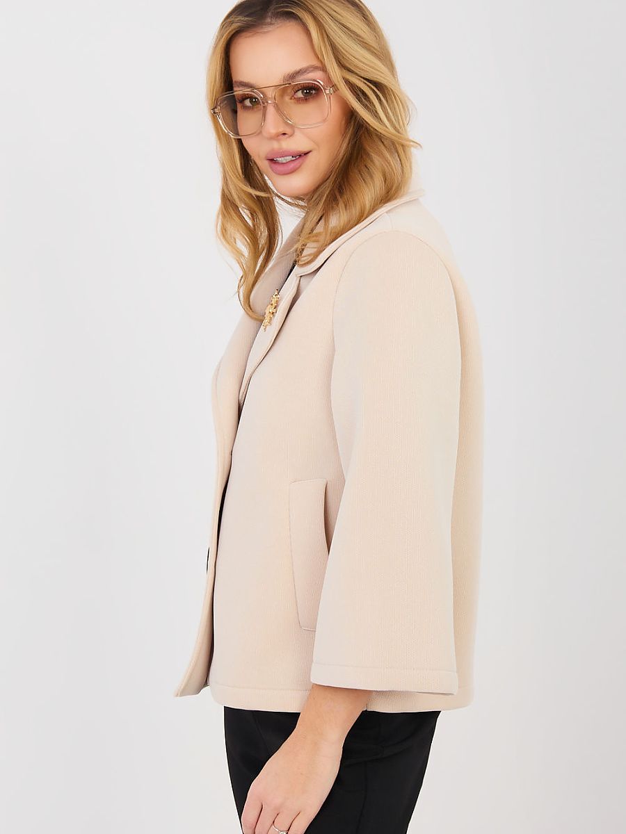 An elegant women’s transitional coat made of modern foam material is a stylish proposition for the autumn, winter, and spring season. Made of high-quality polyester and elastane blend, it provides comfort, lightness, and aesthetically fits the silhouette. The short length and smooth pattern model will work perfectly in both everyday stylizations and at work. The 3/4 length sleeve adds subtle elegance and lightness to the coat. The single-breasted button closure emphasizes the classic character of the cut. The coat has no insulation or padding, making it ideal as a transitional cover. Practical slip pockets increase functionality, and the decorative brooch is an elegant accent that complements the overall style.