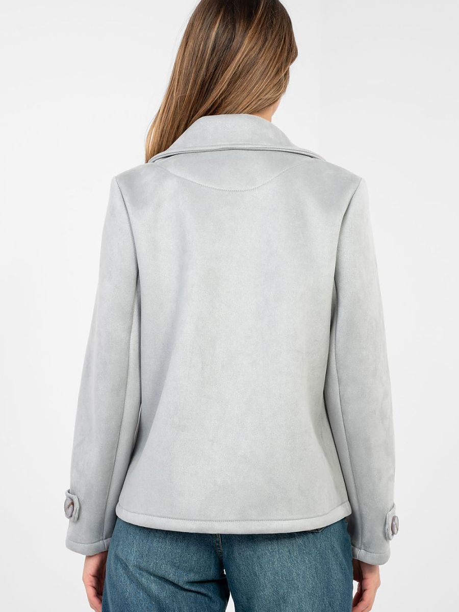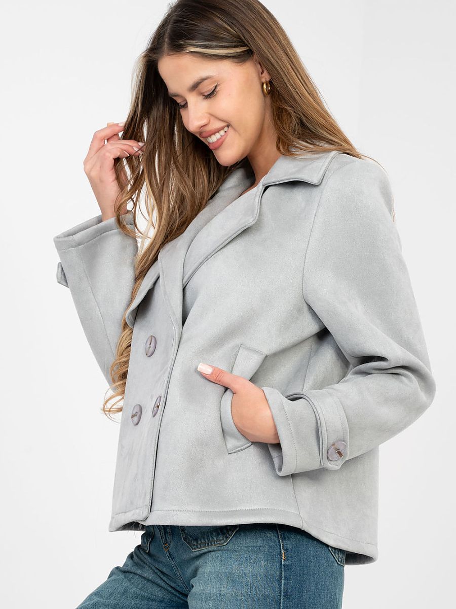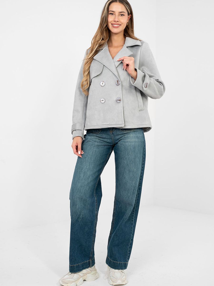 Suede women’s transitional coat is a stylish proposal in a casual edition, perfect for everyday wear. It will work perfectly in the autumn, winter, and spring seasons as a light outer layer that will emphasize the character of any styling. The short length model is made of a pleasant to the touch material based on polyester with the addition of elastane. The smooth texture gives it an elegant simplicity, and the slightly elastic fabric ensures comfort and freedom of movement. The coat has no insulation or filling, making it ideal for transitional periods. The double-breasted button closure emphasizes the classic cut, while the collar with lapels adds elegance to the whole. The long sleeve decorated with a buttoned strap is a subtle, stylish detail. Practical slip pockets increase the functionality of the model. This is a versatile coat that you can easily match with both jeans and boots and more elegant, everyday sets.