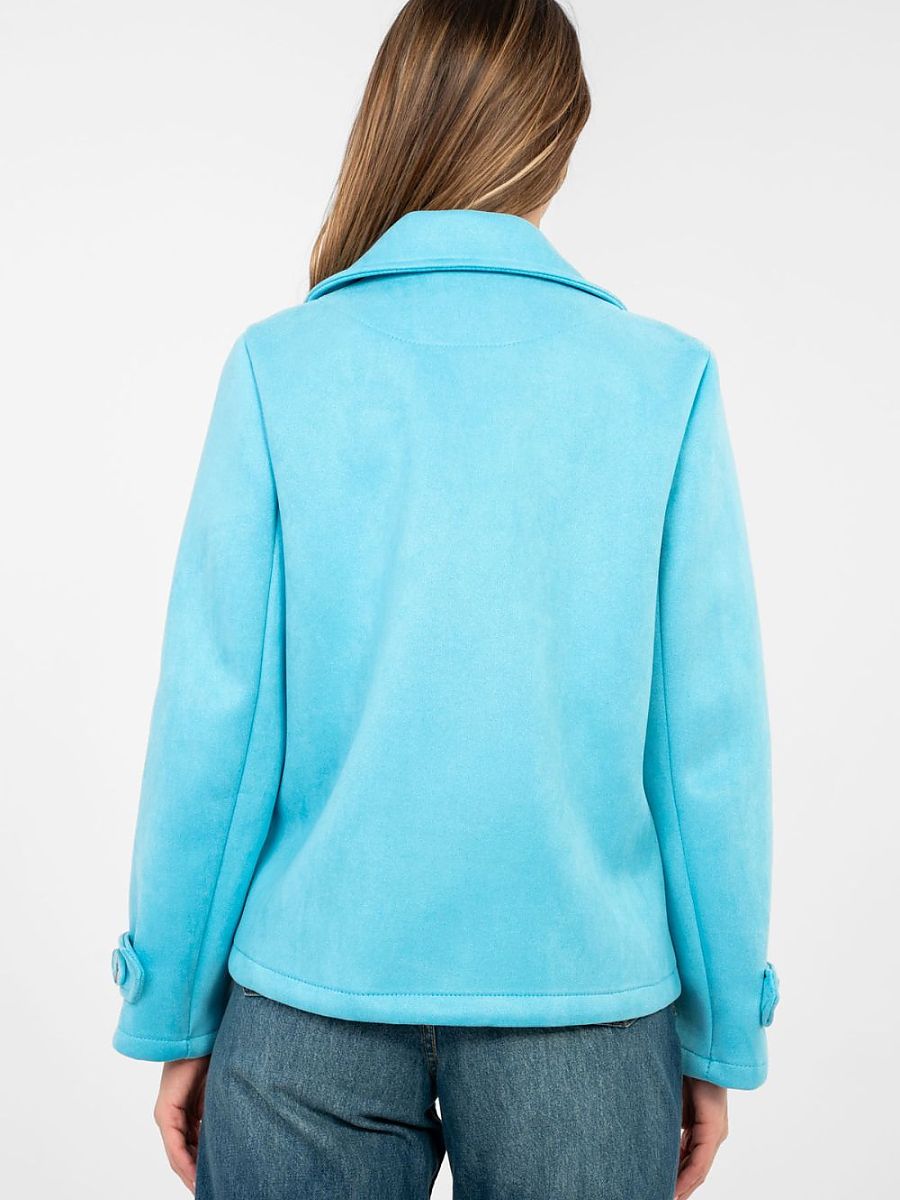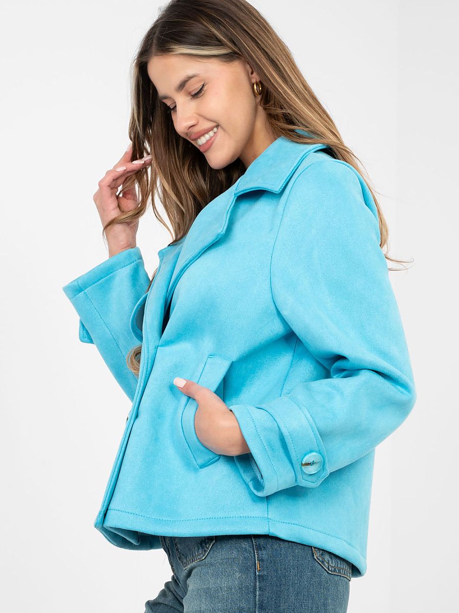 Suede women’s transitional coat is a stylish proposal in a casual edition, perfect for everyday wear. It will work perfectly in the autumn, winter and spring season as a light outer layer that will emphasize the character of each styling. The short length model is made of pleasant to the touch material based on polyester with the addition of elastane. The smooth texture gives it elegant simplicity, and the slightly elastic fabric provides comfort and freedom of movement. The coat has no insulation or filling, which makes it perfect for transitional periods. The double-breasted button closure emphasizes the classic cut, and the collar with lapels adds elegance to the whole. The long sleeve decorated with a buttoned strap is a subtle, stylish detail. Practical slip pockets increase the functionality of the model. It is a versatile coat that you can easily match with both jeans and boots, as well as with more elegant, everyday outfits.