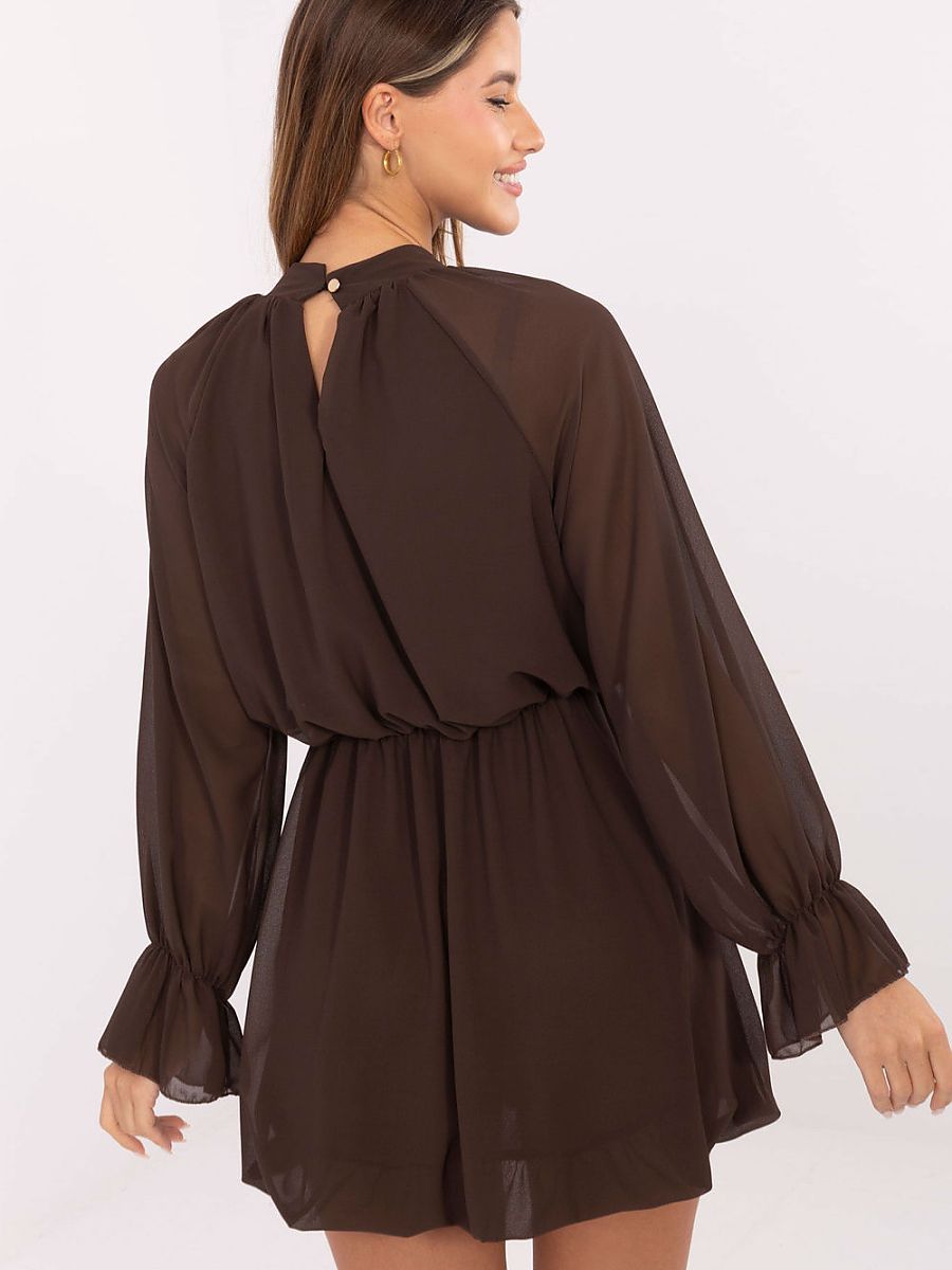 This flared cocktail dress is a proposal for women who like to look elegant and classy. Made of a high-quality blend of polyester, viscose, and elastane, it beautifully drapes on the silhouette, providing comfort at the same time. The elastic waistband emphasizes the waist and ensures a perfect fit. The mini length model with long sleeves delights with subtle details, ruffles at the sleeves add lightness, and the jabot with a decorative rose on the front attracts attention and emphasizes the unique character of the dress. The round neckline gives the whole outfit a touch of class, and the smooth pattern makes the creation look elegant and timeless. The dress has no fastening, making it extremely comfortable to put on. The lining ensures comfort and perfect material placement. This is the perfect choice for a party, reception, or New Year’s Eve, adding grace and confidence in any situation.
