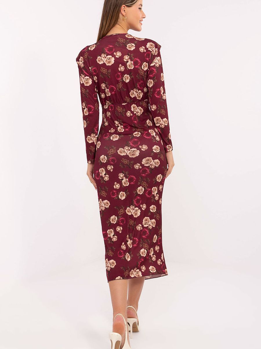 Stylish pencil dress is the perfect choice for special occasions. Made of a pleasant to the touch blend of viscose and polyester, it beautifully fits the silhouette, emphasizing feminine shapes. The model has a midi length and long sleeves, giving it class and elegance. There is a striking slit on the front reaching the thigh, which subtly exposes the leg, adding a sensual character to the whole. The wrap neckline visually slims the neck and emphasizes the neckline, and decorative ruches with a metal ornament are an elegant accent that catches the eye. The dress in a floral pattern will be perfect for parties, receptions, and formal occasions, combining femininity, style, and comfort in one.