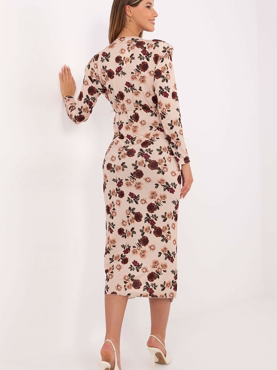 Stylish pencil dress is the perfect choice for special occasions. Made of a pleasant to the touch blend of viscose and polyester, it beautifully fits the silhouette, emphasizing feminine shapes. The model has a midi length and long sleeves, giving it class and elegance. At the front, there is a striking slit reaching the thigh, which subtly exposes the leg, adding a sensual character to the whole. The wrap neckline visually slims the neck and highlights the neckline, and decorative pleats with a metal decoration are an elegant accent that attracts the eye. The dress in a floral pattern will be perfect for parties, receptions, and formal occasions, combining femininity, style, and comfort in one.