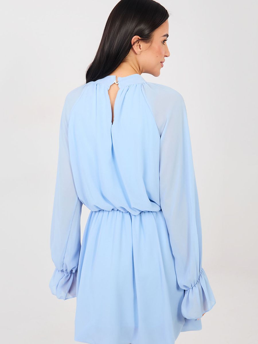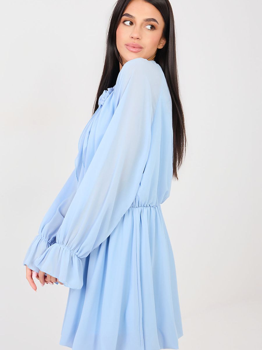 This flared cocktail dress is a proposal for women who like to look elegant and classy. Made of high-quality polyester, viscose, and elastane blend, it beautifully drapes on the silhouette, providing comfort at the same time. The elastic waistband emphasizes the waist and ensures a perfect fit. The mini length model with long sleeves delights with subtle details, frills at the sleeves add lightness, and the jabot with a decorative rose at the front catches the eye and emphasizes the unique character of the dress. The round neckline gives the whole outfit a touch of class, and the smooth pattern makes the creation look elegant and timeless. The dress has no fastening, making it extremely comfortable to put on. The lining ensures comfort and perfect fabric placement. It is an ideal choice for a party, reception, or New Year’s Eve, adding grace and self-confidence in any situation.