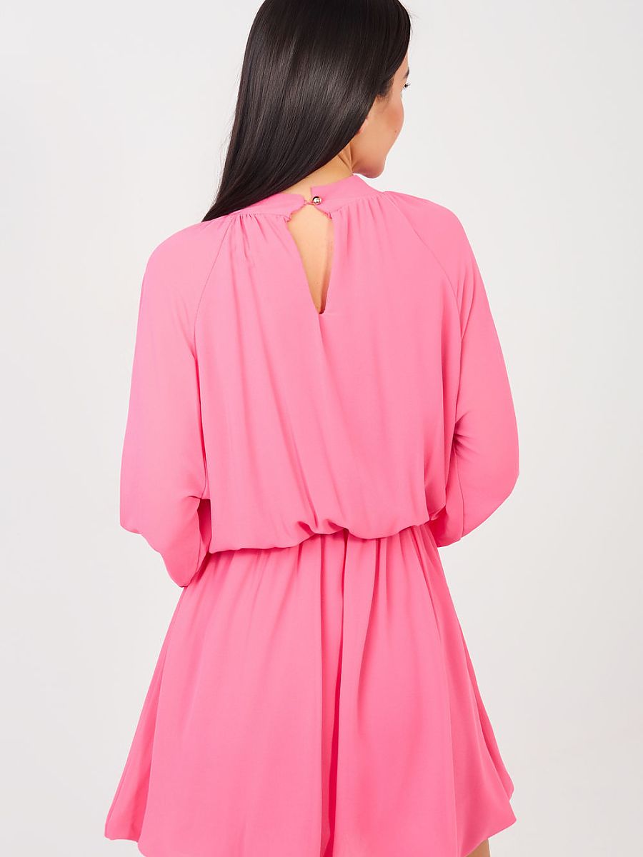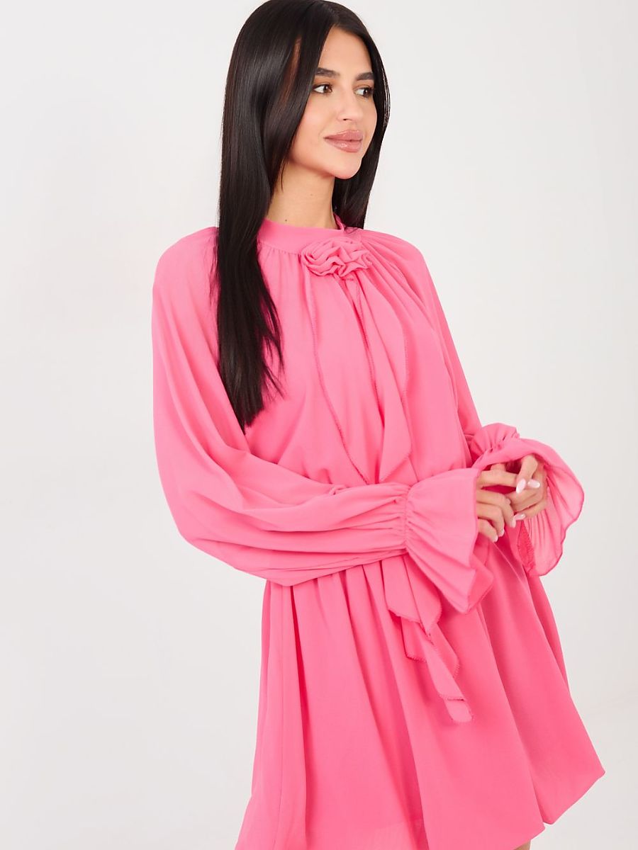 This flared cocktail dress is a proposal for women who like to look elegant and classy. Made of high-quality polyester, viscose, and elastane blend, it beautifully drapes on the silhouette, providing comfort at the same time. The elastic waistband emphasizes the waist and guarantees a perfect fit. The mini-length model with long sleeves delights with subtle details, ruffles at the sleeves add lightness, and the jabot with a decorative rose on the front attracts attention and emphasizes the unique character of the dress. The round neckline gives the whole class, and the smooth pattern makes the outfit look elegant and timeless. The dress has no fastening, which makes it extremely comfortable to put on. The lining provides comfort and excellent fabric placement. It is the perfect choice for a party, reception, or New Year’s Eve, it will add charm and confidence in any situation.