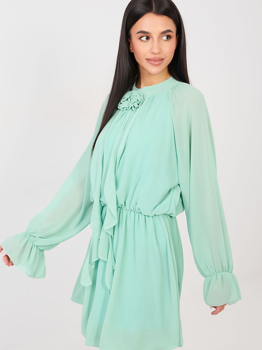 This flared cocktail dress is a proposal for women who like to look elegant and classy. Made of high-quality polyester, viscose and elastane blend, it beautifully drapes on the silhouette, providing comfort at the same time. The waistband emphasizes the waist and guarantees a perfect fit. The mini length model with long sleeves delights with subtle details, frills at the sleeves add lightness, and the jabot with a decorative rose on the front attracts attention and emphasizes the unique character of the dress. The round neckline adds class to the whole, and the smooth pattern makes the outfit look elegant and timeless. The dress has no fastening, making it extremely comfortable to put on. The lining ensures comfort and perfect fabric placement. It is the perfect choice for a party, reception, or New Year’s Eve, adding charm and self-confidence in any situation.