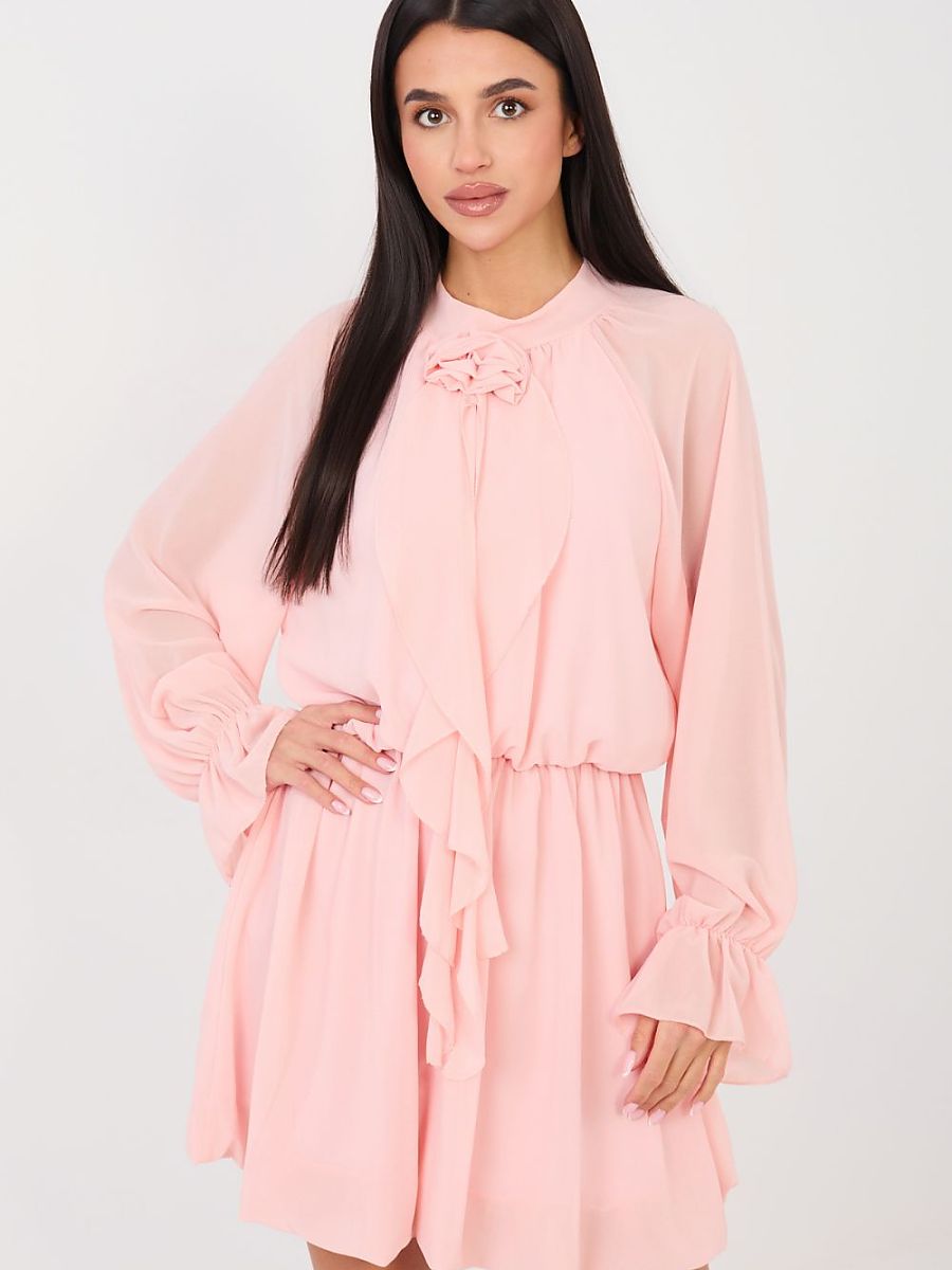 This flared cocktail dress is a proposal for women who like to look elegant and classy. Made of high-quality blend of polyester, viscose, and elastane, it beautifully lays on the silhouette, providing comfort at the same time. The elastic waistband emphasizes the waist and guarantees a perfect fit. The mini length model with long sleeves delights with subtle details, ruffles at the sleeves add lightness, and the jabot with a decorative rose on the front attracts attention and emphasizes the unique character of the dress. The round neckline gives the whole class, and the smooth pattern makes the outfit look elegant and timeless. The dress has no fastening, making it extremely comfortable to put on. The lining provides comfort and perfect material placement. It is an ideal choice for a party, reception, or New Year’s Eve, adding charm and confidence in any situation.