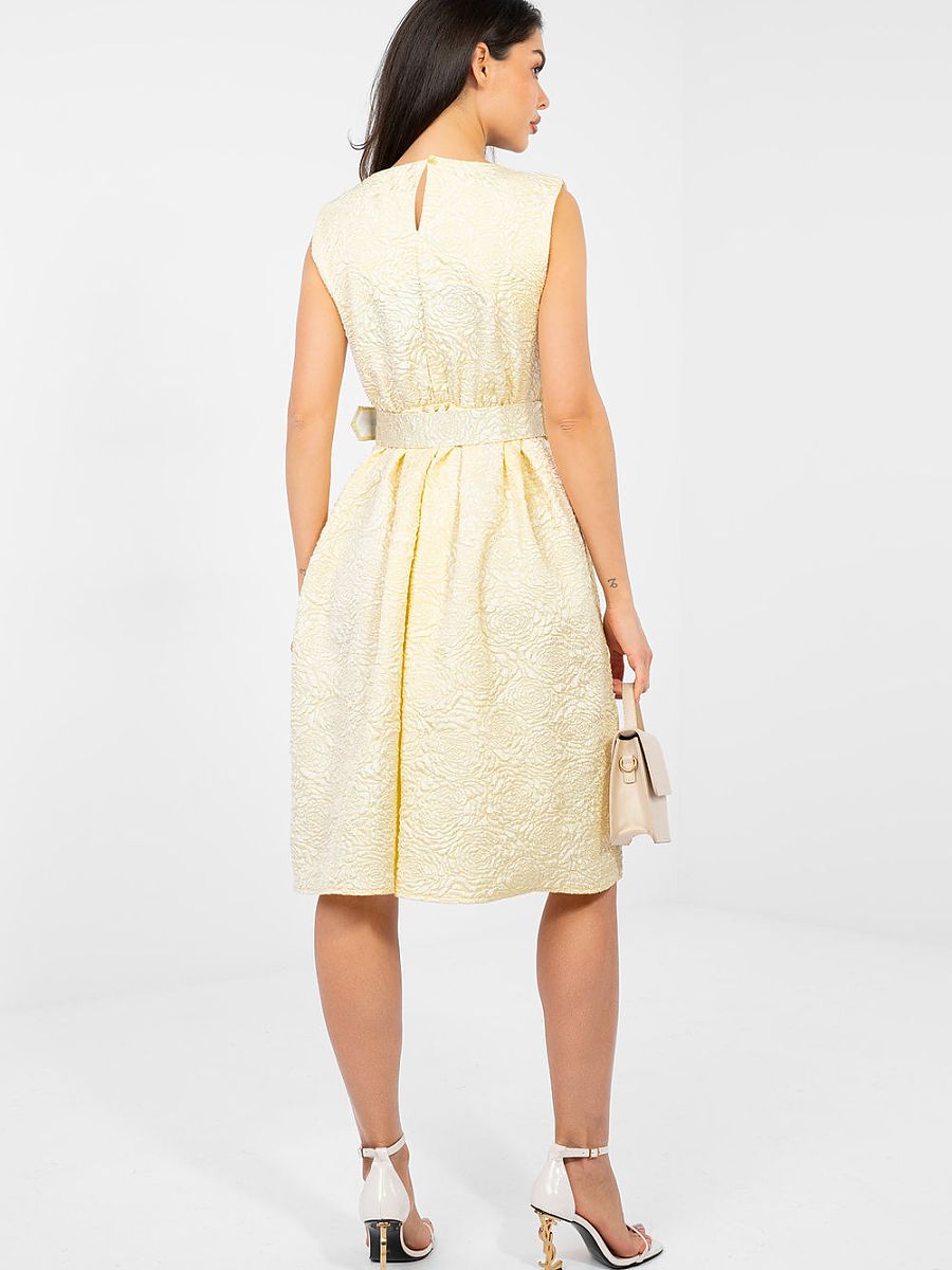 Elegant cocktail dress designed for special occasions and stylish parties. The flared cut beautifully accentuates the waist and gives the silhouette a lightness, while the knee-length adds class and timeless elegance. The dress is made of high-quality polyester and viscose blend, which ensures comfort and excellent fabric draping. The varied texture of the fabric gives the whole a unique character and subtle depth. Sleeveless dress with a classic round neckline looks extremely chic. Cinched at the waist, with decorative pleats, it beautifully shapes the silhouette and accentuates feminine curves. The set includes a fastened belt, which further highlights the waist, and a detachable flower-shaped brooch, allowing you to adjust the styling to the occasion. It is a perfect choice for parties, family celebrations, and elegant meetings when you want to look exceptionally classy.