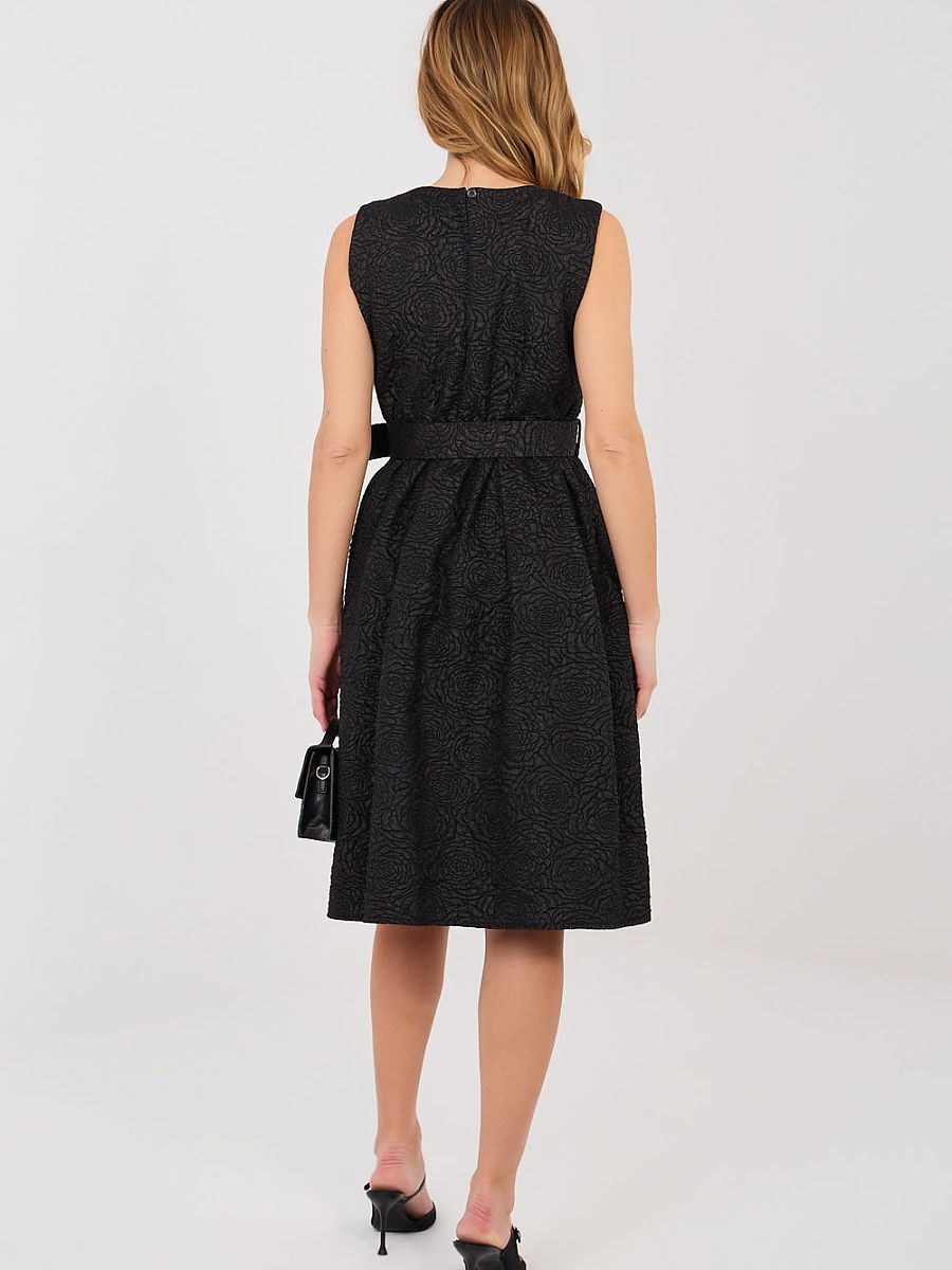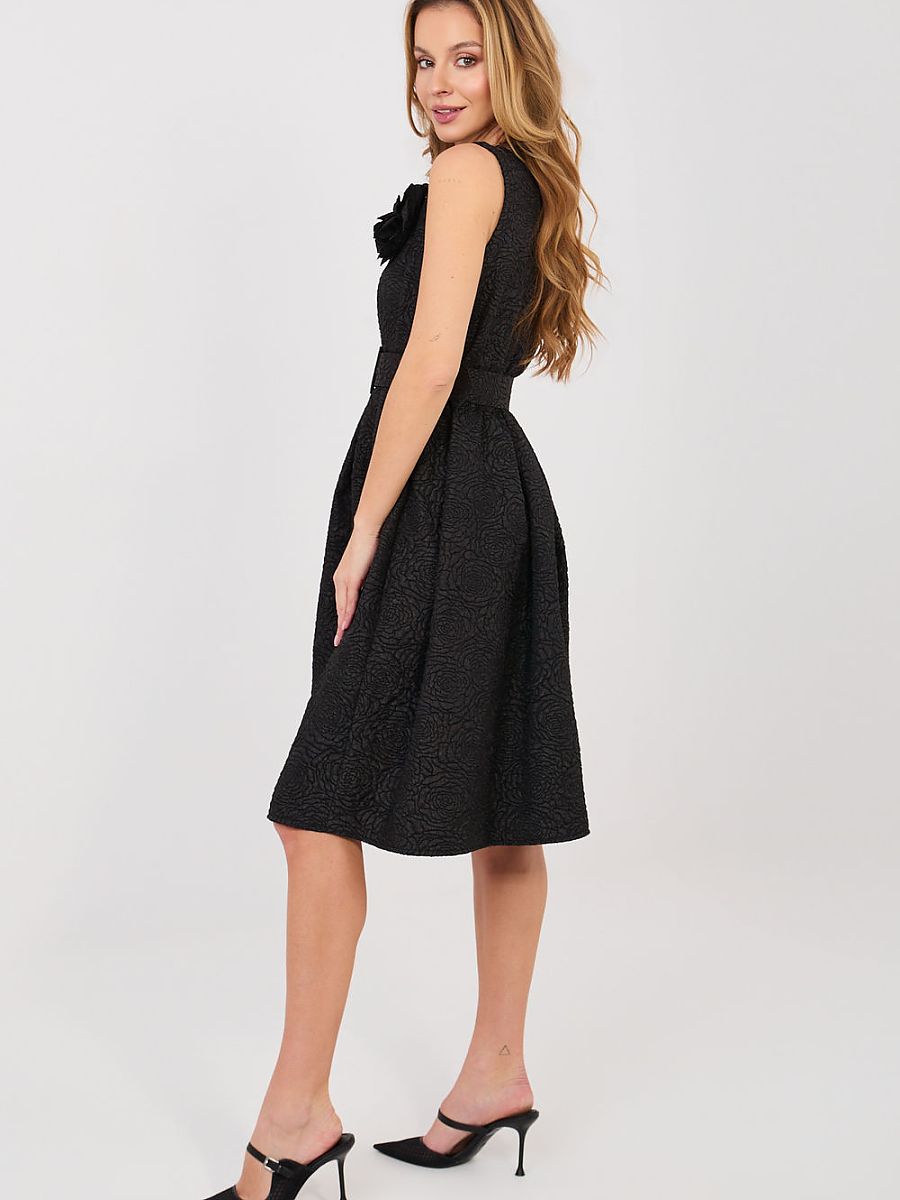 Elegant formal dress designed for special occasions and stylish night outs. The flared cut beautifully emphasizes the waist and adds lightness to the silhouette, while the knee-length adds class and timeless elegance. Made of high-quality polyester and viscose blend, which ensures comfort and perfect fabric draping. The varied texture of the fabric gives the whole outfit an original character and subtle depth. Sleeveless dress with a classic round neckline looks extremely chic. Cinched at the waist, with decorative pleats, beautifully shapes the silhouette and emphasizes feminine curves. The set includes a fastened belt, which additionally accentuates the waist, and a detachable flower-shaped brooch, allowing you to adjust the outfit to the occasion. It is a perfect choice for receptions, family celebrations, and elegant meetings when you want to look exceptionally classy.