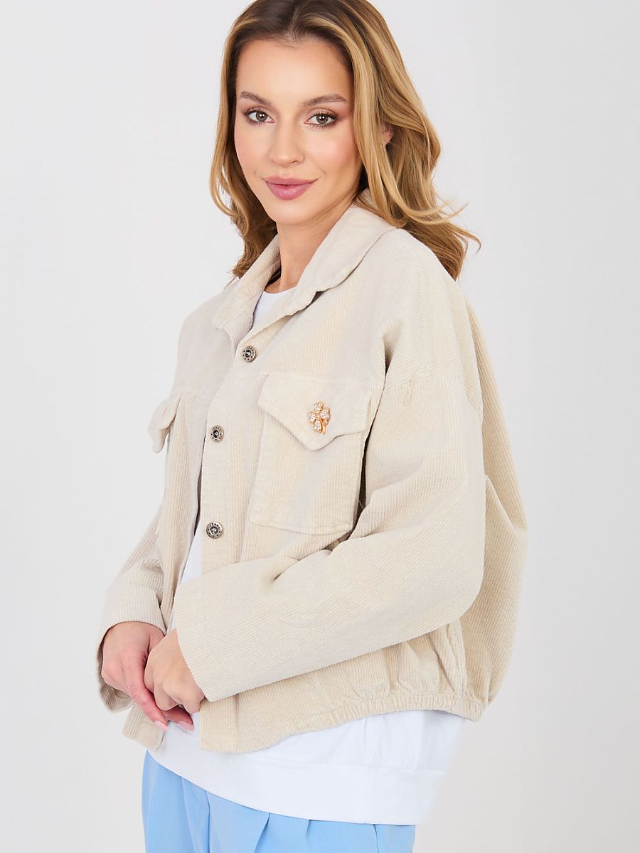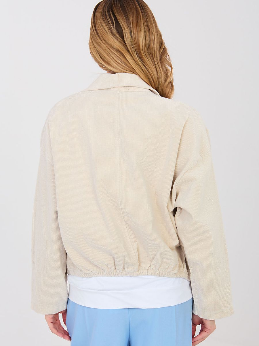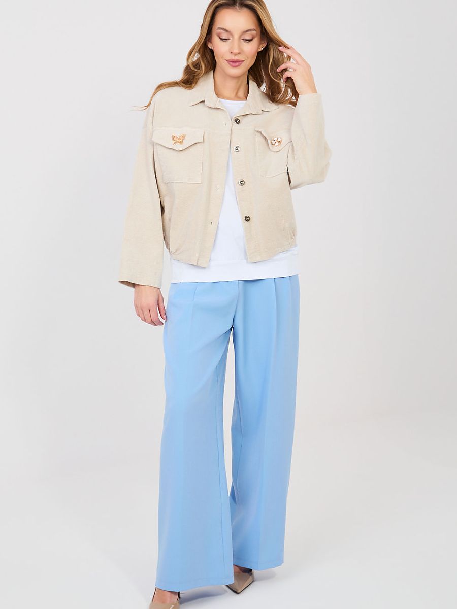 Modern, women’s corduroy jacket in a casual style, perfect for everyday, transitional days. This model combines the classic bomber jacket cut with a trendy, slightly retro finish, creating a versatile option for many stylizations. The jacket is made of high-quality cotton with a touch of elastane, which ensures comfort and gentle material elasticity. It has a smooth pattern, a short cut, and long sleeves, which give lightness and a modern character. Practical flap pockets on the front allow you to conveniently store small items, while button fastening and an elastic band at the bottom ensure a comfortable fit. An additional advantage are detachable decorative brooches, allowing you to personalize the look of the jacket. The model is finished with a classic collar, emphasizing the elegant character of the bomber jacket, while maintaining a casual, relaxed style. It is the perfect choice for women looking for a practical and stylish jacket for spring or autumn.