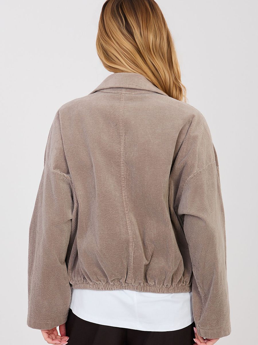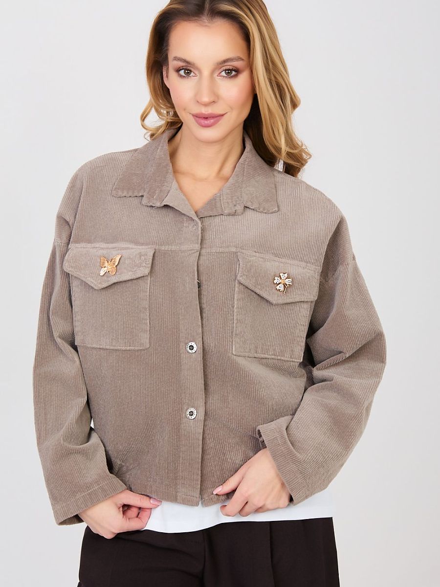 Modern, women’s corduroy jacket in a casual style, perfect for everyday, transitional days. This model combines the classic bomber jacket cut with a trendy, slightly retro finish, creating a versatile option for many stylizations. The jacket is made of high-quality cotton with the addition of elastane, which ensures comfort and gentle material elasticity. It has a smooth pattern, a short cut, and long sleeves that give lightness and a modern character. Practical flap pockets at the front allow you to conveniently store small items, and button fastening and an inserted elastic at the bottom ensure a comfortable fit. An additional advantage is the detachable decorative brooches that allow you to personalize the jacket’s appearance. The model is finished with a classic collar, emphasizing the elegant character of the bomber jacket, while maintaining a casual, relaxed style. This is the perfect choice for women looking for a practical and stylish jacket for spring or autumn.