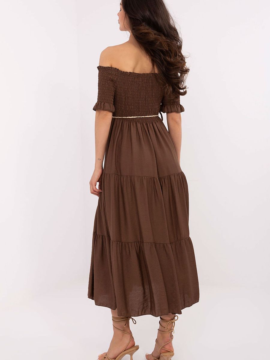 A summer midi dress with a flared cut is a perfect choice for both everyday wear and special occasions. Made of a lightweight and breathable blend of viscose and nylon, it provides comfort on warm days. The smooth fabric emphasizes the elegant yet subtle character of the dress. The top is finished with a neckline in a Spanish style with gathers and elastic bands, beautifully exposing the shoulders and adding femininity to the outfit. Short sleeves finished with ruffles add lightness and romantic charm. The model does not have a closure, it is put on over the head. There is a belt at the waist for tying, which allows you to emphasize the silhouette and adjust the dress to the figure. Perfect for walks, summer parties, or gatherings with loved ones.