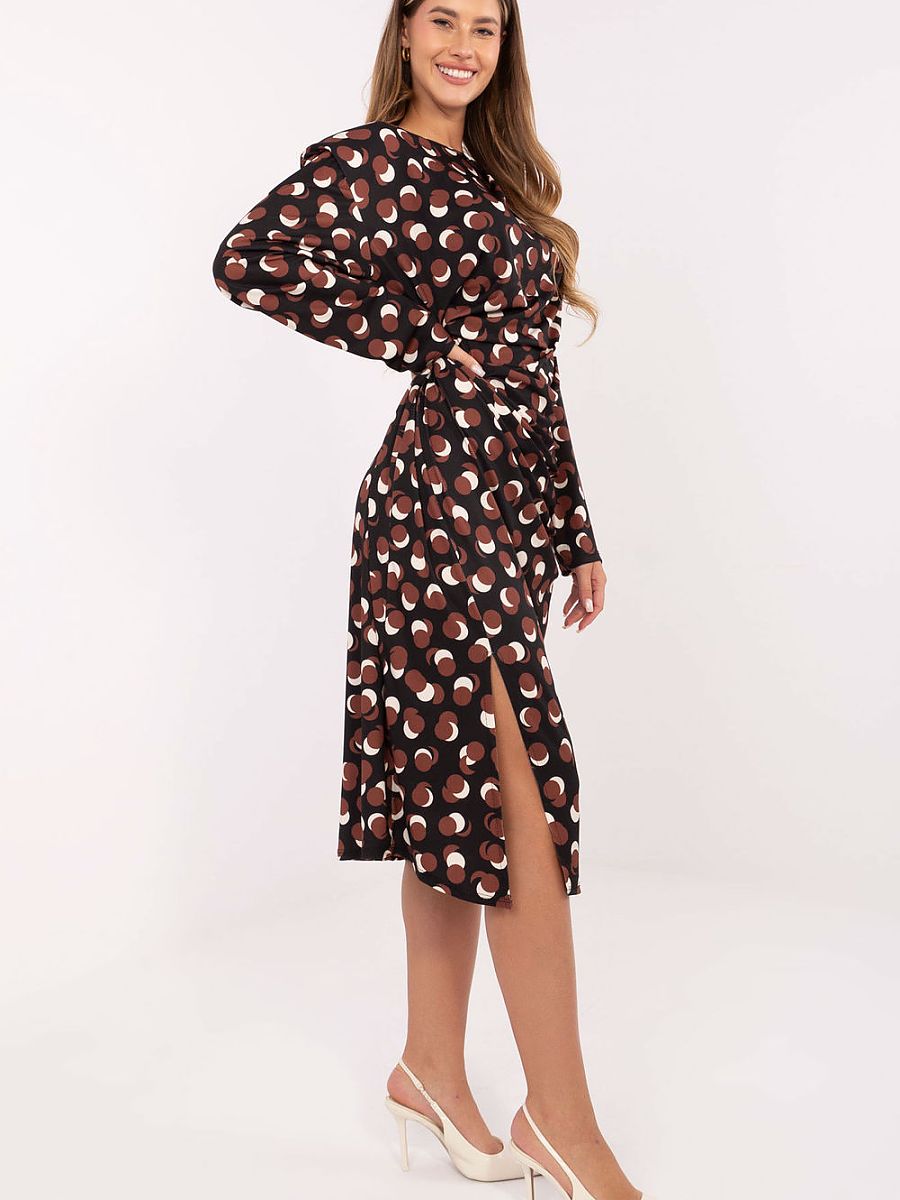 An elegant midi dress in a simple, classic cut is the perfect choice for many occasions, from work to formal meetings or everyday outings. Made from a high-quality blend of viscose and polyester, it combines comfort with durability. The geometric pattern gives it a modern character, while the shoulder pads subtly emphasize the silhouette. The model with long sleeves and a round neckline looks extremely elegant. Draping on the right side at the waist area, as well as the eye-catching ruching beautifully shape the figure, adding lightness and feminine charm. The dress has no fastening, making it comfortable to put on.