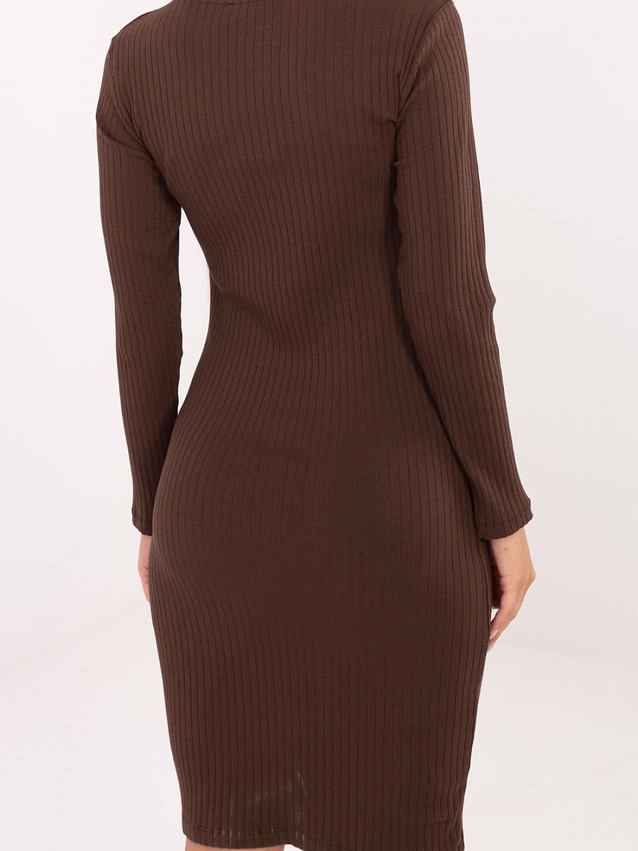 This daily pencil dress is a combination of comfort and classic elegance, perfect for both work and everyday wear. Made of soft, ribbed cotton with a touch of elastane, it perfectly fits the silhouette and ensures full comfort of wearing. The smooth fabric and round neckline give it a timeless, minimalist character. The dress is knee-length with long sleeves, making it suitable for any time of the year. The model has no fastening, which makes it easy to put on and emphasizes its practical, everyday style. This is a versatile option that will work in many situations.