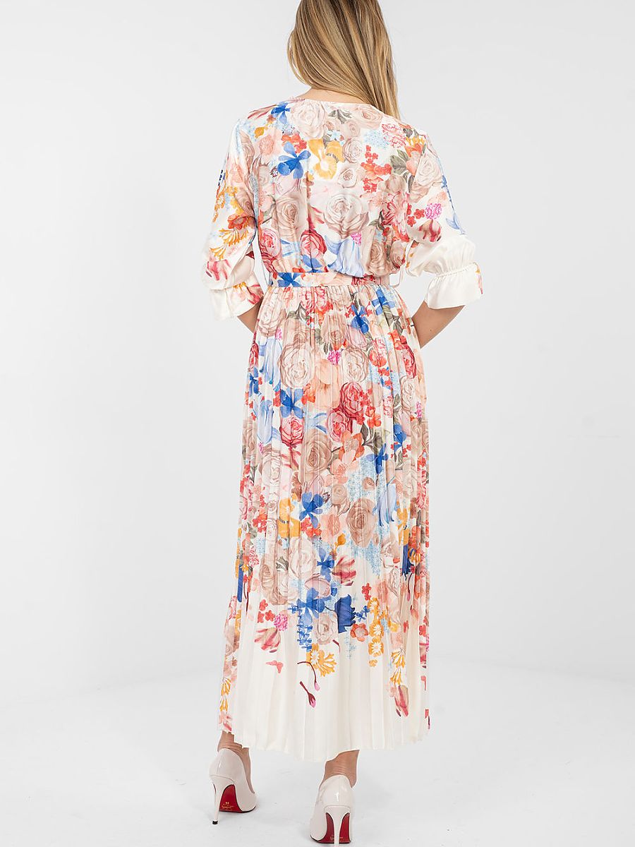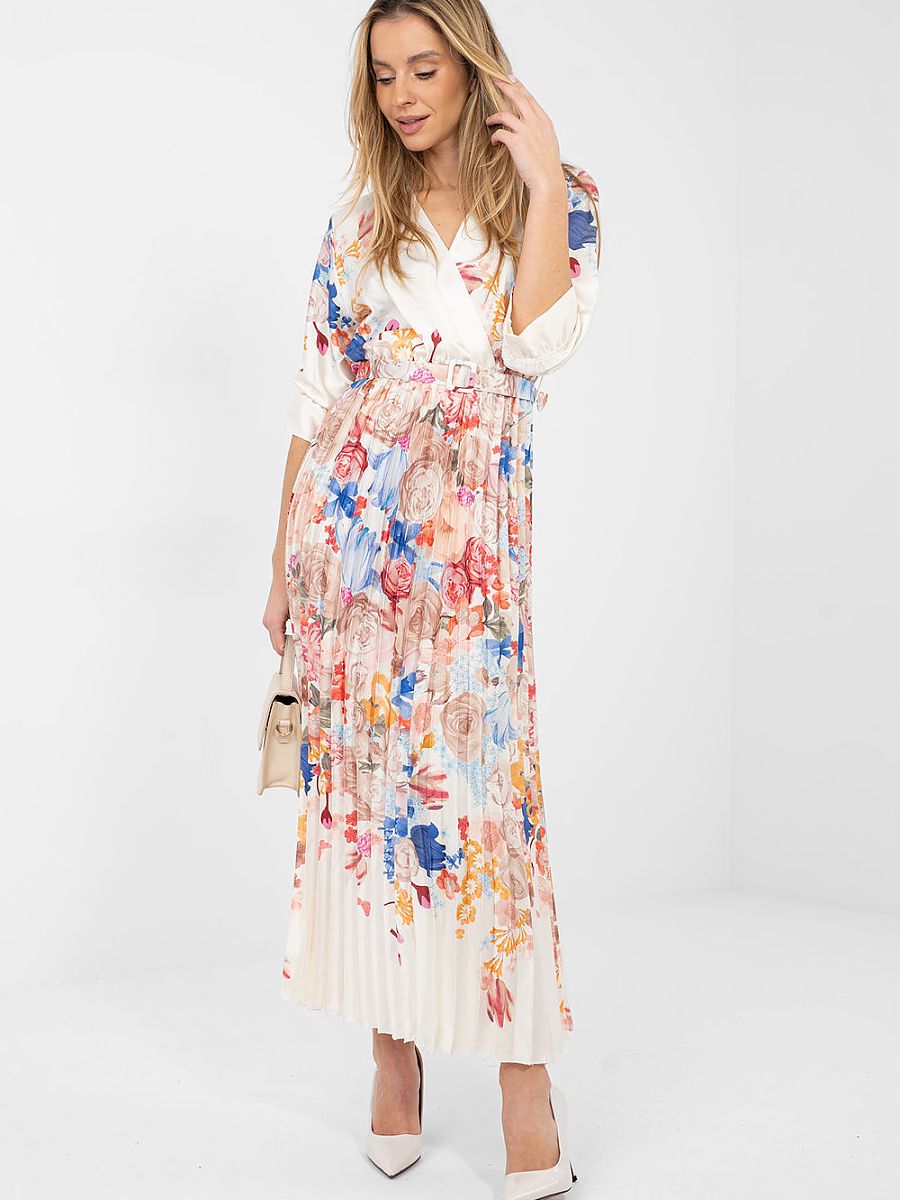 A summer maxi dress with a flared silhouette is a combination of lightness, elegance, and feminine style. The model captivates with a floral pattern that gives the styling freshness and subtle charm, perfectly fitting into the summer atmosphere. The wrap neckline beautifully emphasizes the neck and décolletage line, and the 3/4 sleeves finished with a flounce add a romantic character to the whole. From the waist down, the dress is made of pleated material, which elegantly falls in motion and gives the silhouette lightness. There is a fastened belt at the waist, allowing you to emphasize feminine shapes and adjust the model to the figure. The dress has no fastening, which ensures comfortable wearing. Made of a combination of polyester and viscose, it is breathable, light, and comfortable. It will work perfectly in everyday stylings, for work, as well as for formal occasions, just choose the right accessories to create an elegant, summer look.