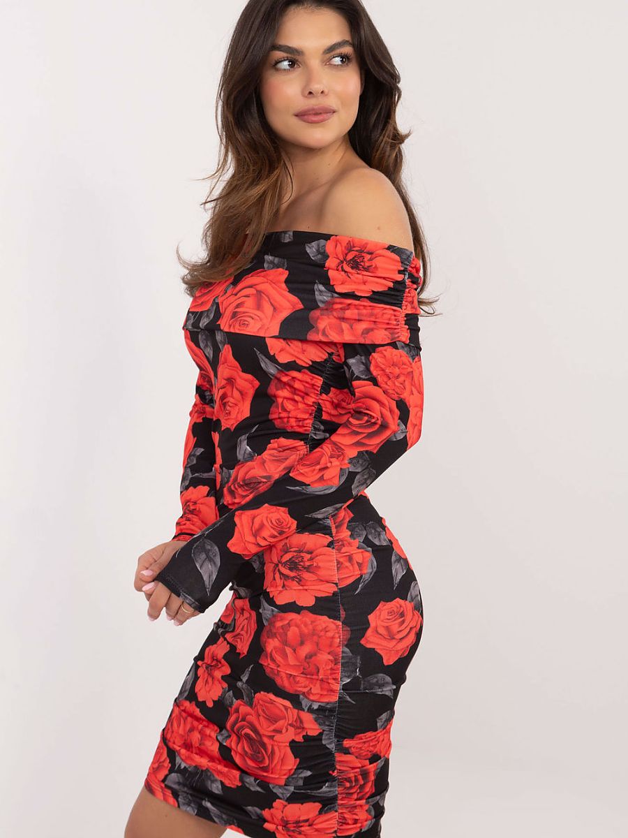 Elegant pencil dress, perfect for any occasion. A sensual Spanish neckline and decorative creases add to its unique character. The vivid floral pattern makes the dress both fashionable and original. The long sleeve and length before the knee guarantee comfortable wearing.