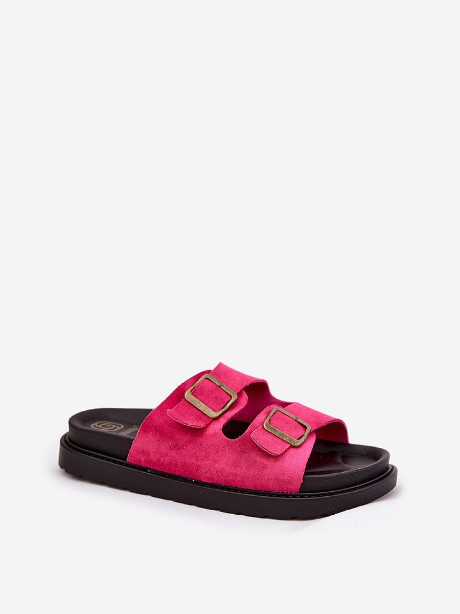 Stylish slippers made of eco-suede. Set on a platform that combines comfort with a fashionable look. Straps with buckles ensure a perfect fit, and a profiled insole guarantees comfort all day long. These slippers will be a perfect choice for summer days, matching both dresses and trousers.