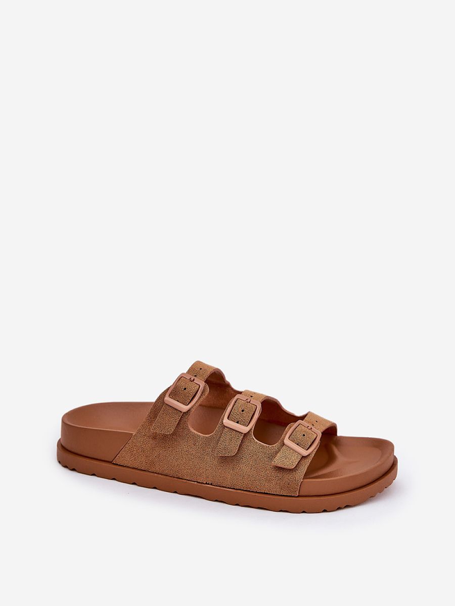 Women’s slippers made of eco suede are an excellent choice for warm days. This model features three adjustable straps with buckles, ensuring a perfect fit for the foot. The contoured insole guarantees comfort throughout the day, making these slippers an ideal choice for walks or holiday trips.
