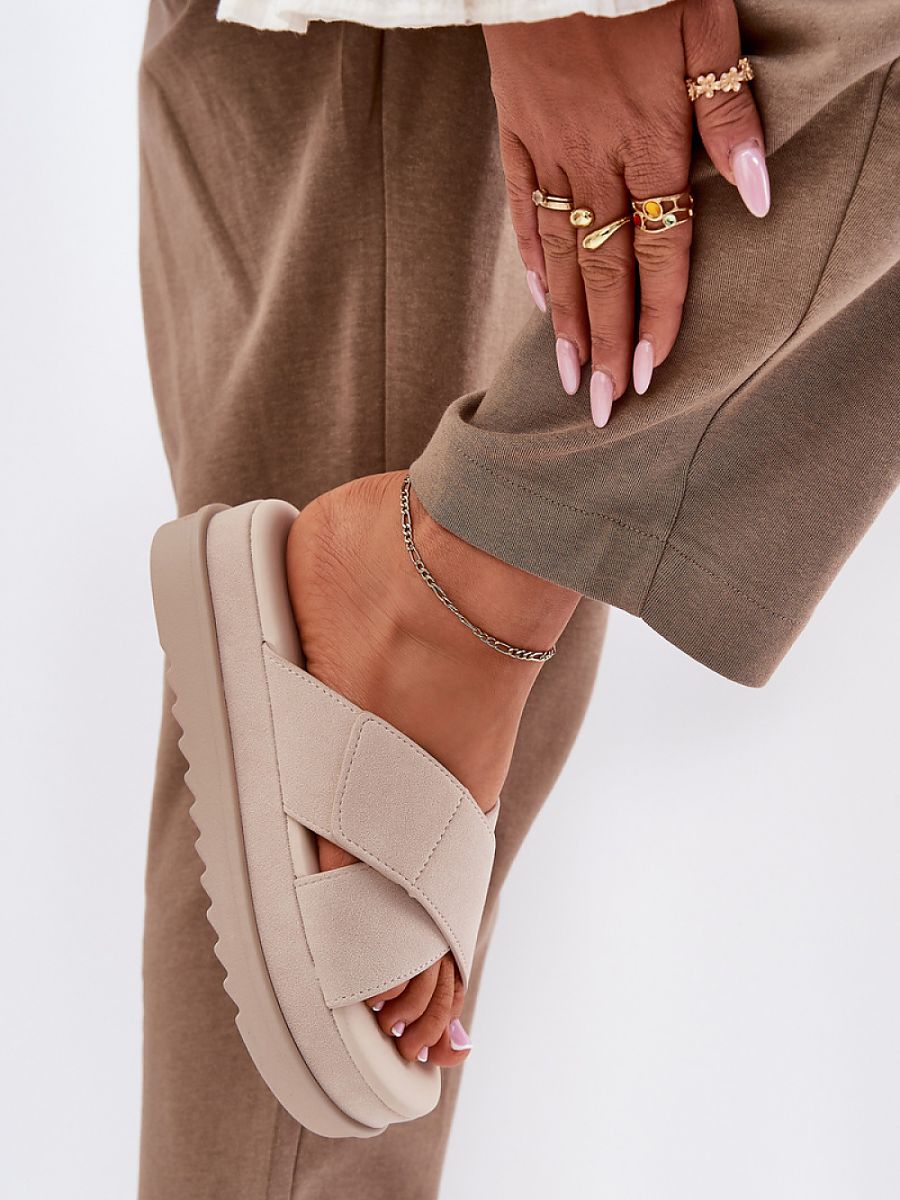 Women’s suede-like sandals are a perfect choice for warm days. Set on a platform, they provide comfort and stability throughout the day. In the front, there are two intertwining straps, one of which has a velcro fastening, allowing for easy adjustment to the foot. These sandals combine comfort with a trendy look, perfect for summer stylings.