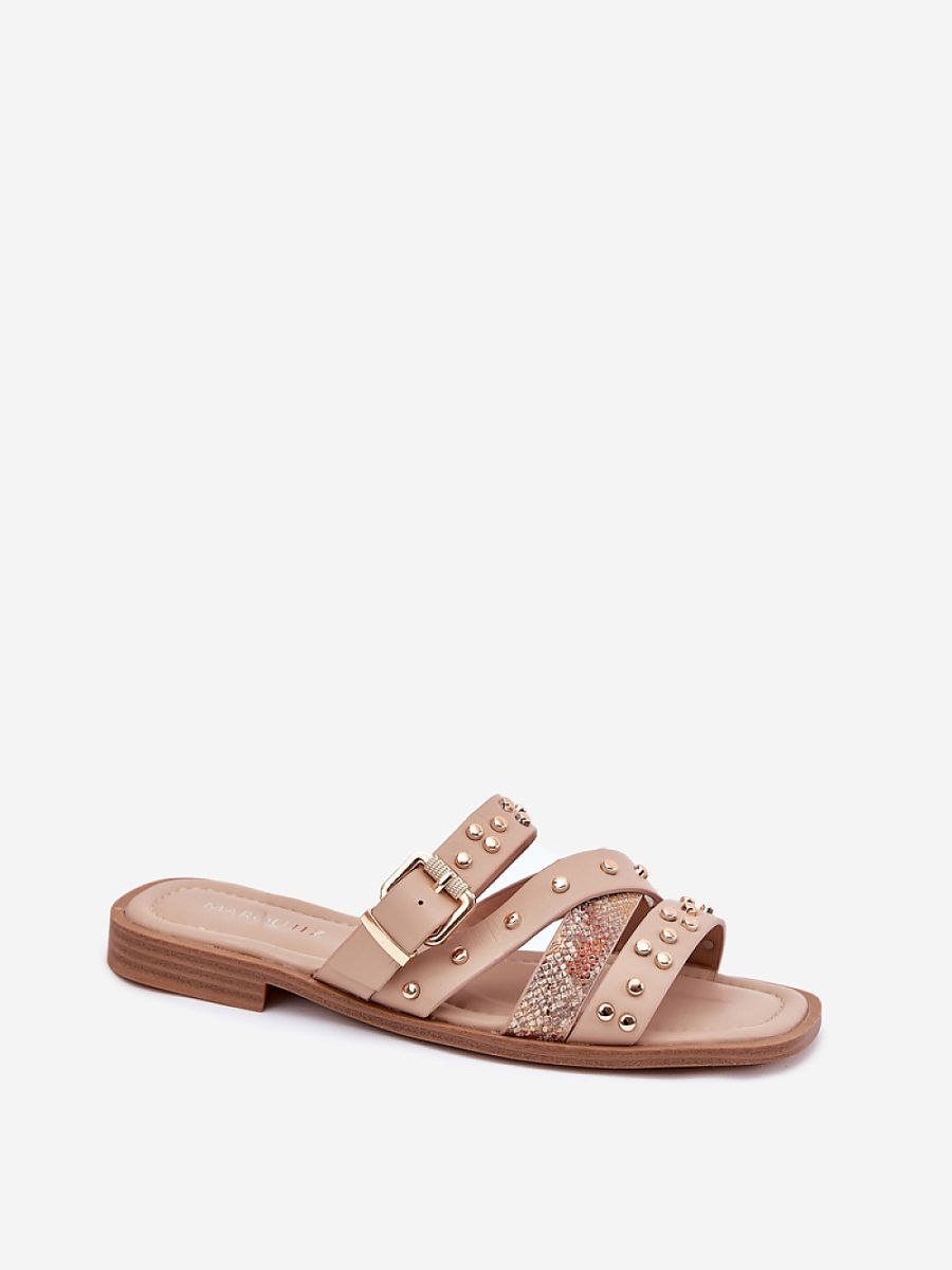 Women’s sandals made of eco leather. Set on a flat heel. The model stands out with subtle decoration, a buckle and straps that give them a modern character. Perfect for everyday styling, combining comfort with a fashionable look, perfect for summer walks or casual outings.