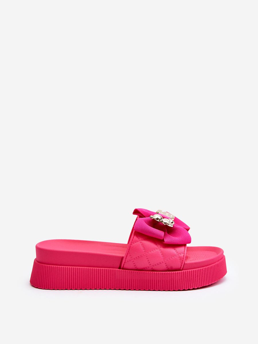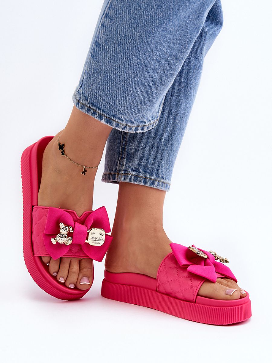 Women’s slippers made of eco leather. Set on a massive platform. This model has a fabric bow and an imitation of a clasp with a bear and a plate with an inscription. Perfect slippers for the upcoming season! You definitely should have them!