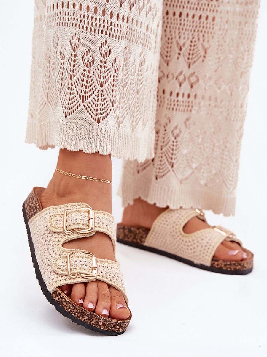 Crocheted women’s slippers on a cork platform are a unique proposal for warm days. Thanks to the profiled insole made of eco-suede, they provide comfort and convenience throughout the day. Two golden buckles add an elegant character to them. Perfect for summer stylizations, these slippers will be an excellent choice for dresses, skirts, and pants.