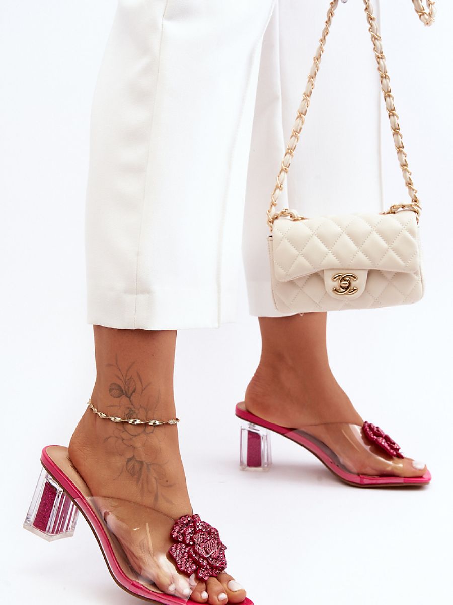 Transparent high-heeled sandals by S.Barski. The shoes are set on a decorated with sequins heel. At the front, there is a jewelry decoration. Soft insole made of natural leather and anti-slip sole will take care of your comfort!