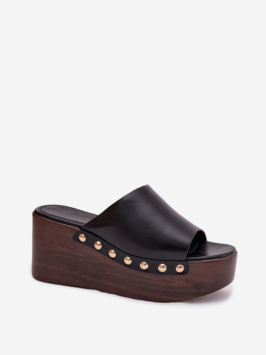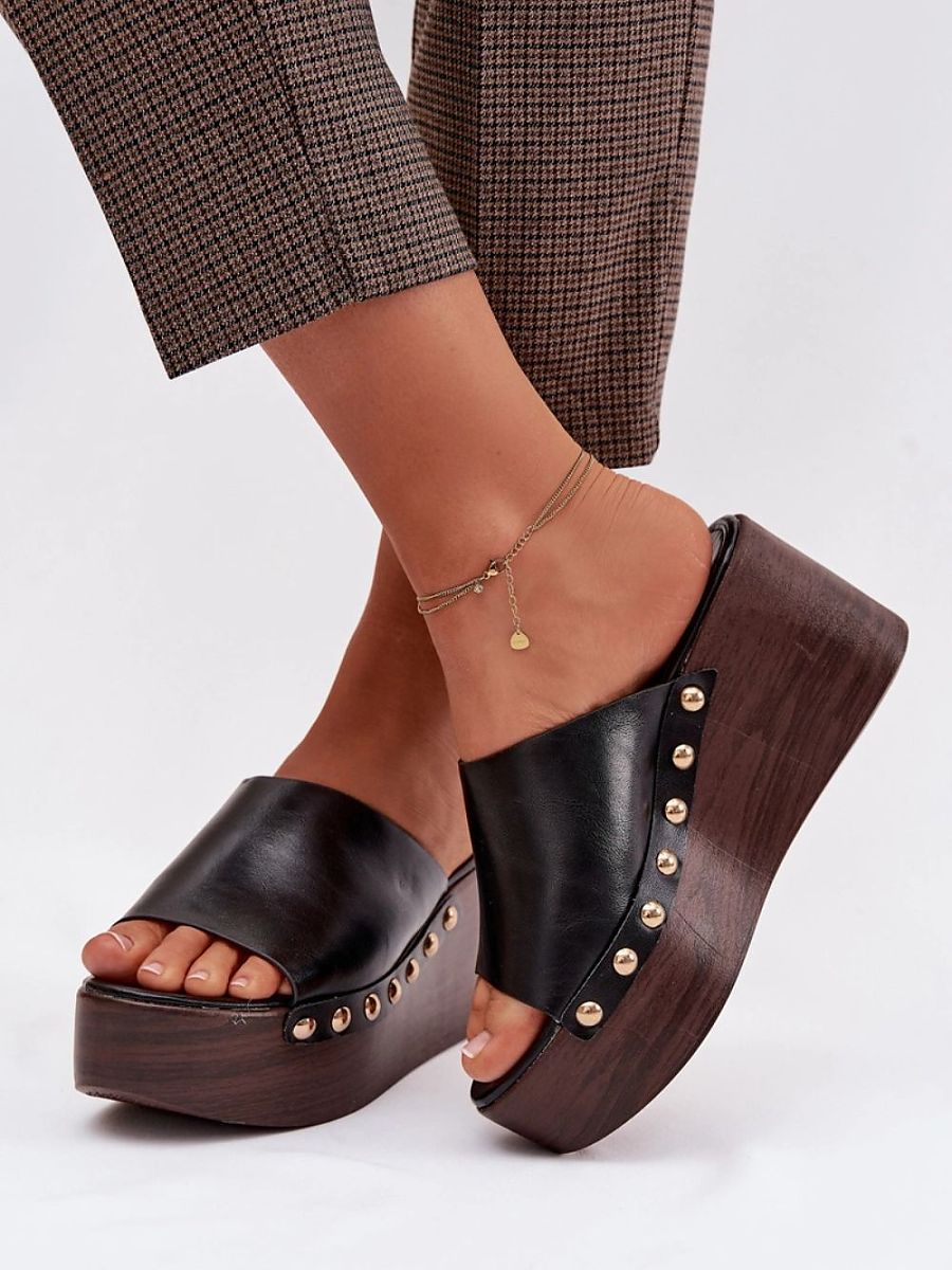Stylish women’s flip-flops made of eco leather are a comfortable and eye-catching proposition for everyday wear. The wedge connected with the platform ensures stability and comfort of wearing, while subtly emphasizing the silhouette. Gold studs placed on the sides add a fashionable character to the whole. The model will work perfectly in summer stylizations, both with dresses, pants or skirts. It is an ideal choice for women who value comfort combined with a distinctive, stylish detail.